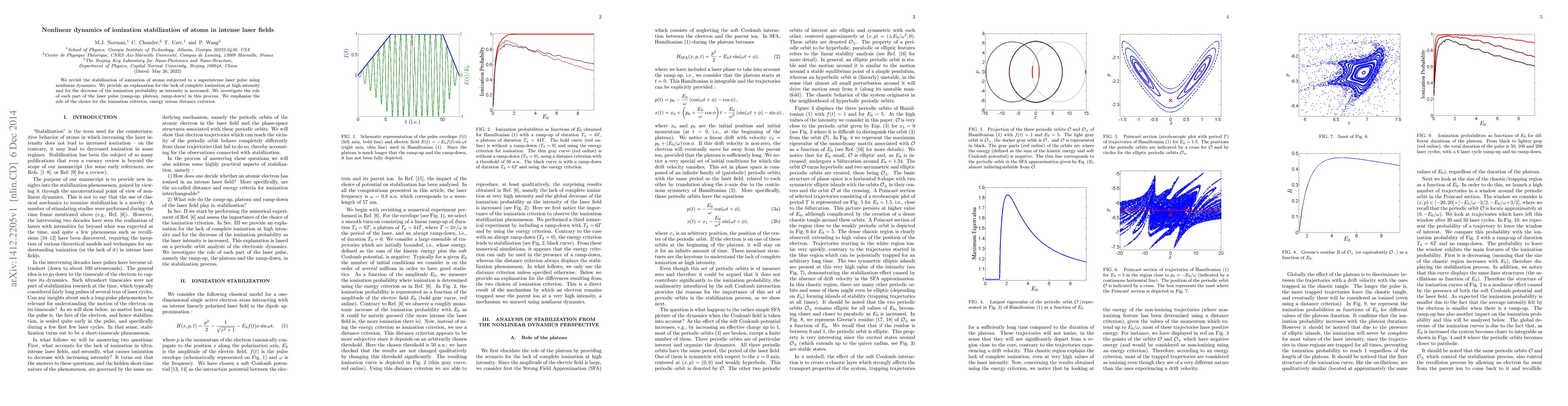 This paper explores the nonlinear dynamics of ionization stabilization in atoms exposed to intense laser pulses, explaining why complete ionization does not occur at high intensities and how ionization probability decreases with increased intensity. It highlights the distinct roles of different parts of the laser pulse and the impact of choosing either energy or distance as the ionization criterion.