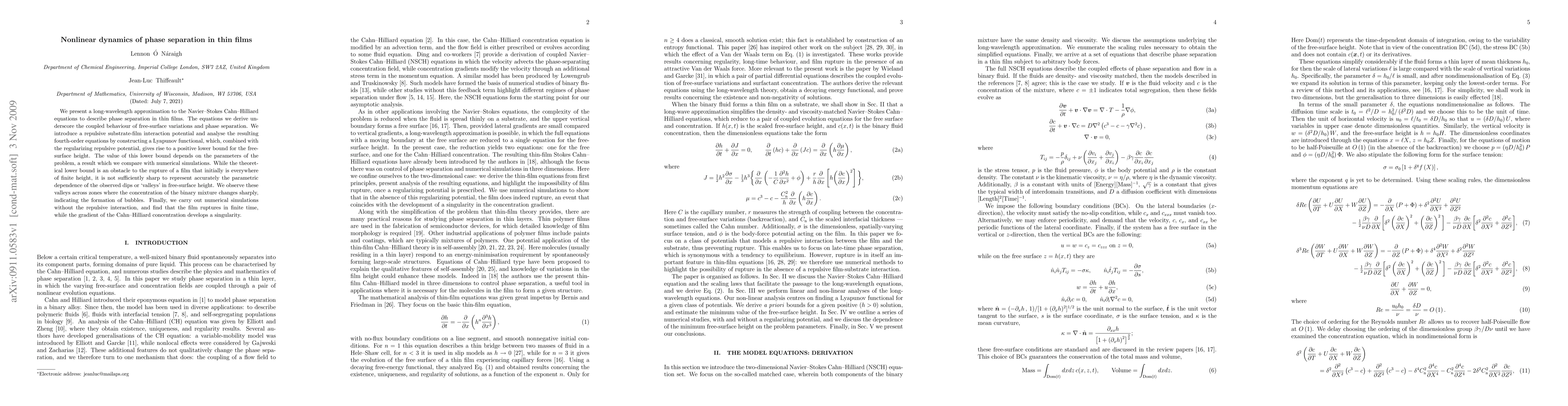 Researchers model phase separation in thin films using a simplified Navier-Stokes equation, finding that a repulsive substrate-film interaction potential creates a lower bound for film height that prevents rupture, but numerical simulations without this term show the film can still rupture over time.
