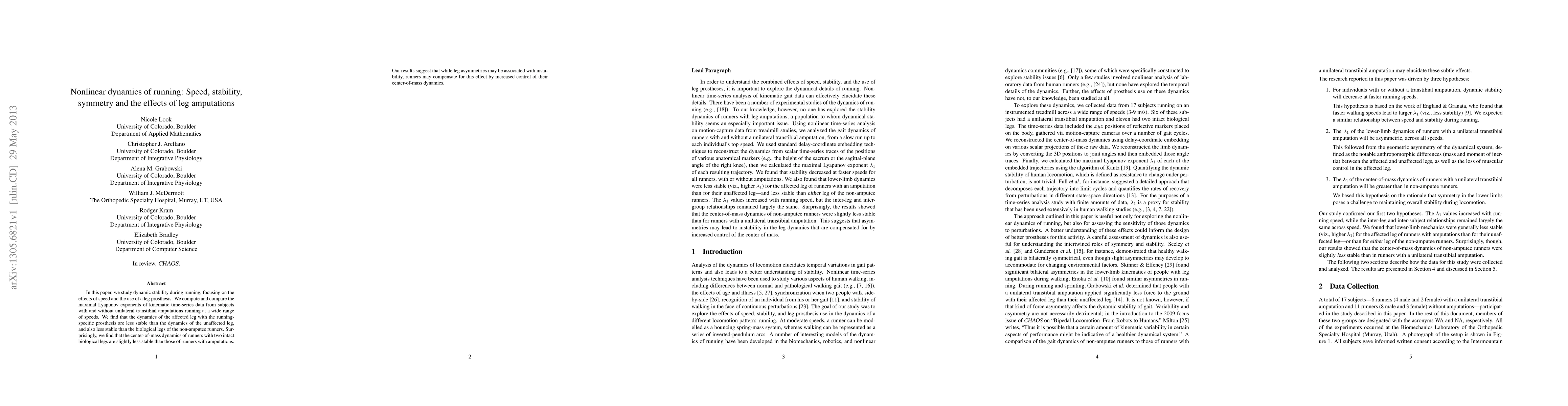 In this paper, we study dynamic stability during running, focusing on the effects of speed and the use of a leg prosthesis. We compute and compare the maximal Lyapunov exponents of kinematic time-series data from subjects with and without unilateral transtibial amputations running at a wide range of speeds. We find that the dynamics of the affected leg with the running-specific prosthesis are less stable than the dynamics of the unaffected leg, and also less stable than the biological legs of the non-amputee runners. Surprisingly, we find that the center-of-mass dynamics of runners with two intact biological legs are slightly less stable than those of runners with amputations. Our results suggest that while leg asymmetries may be associated with instability, runners may compensate for this effect by increased control of their center-of-mass dynamics.