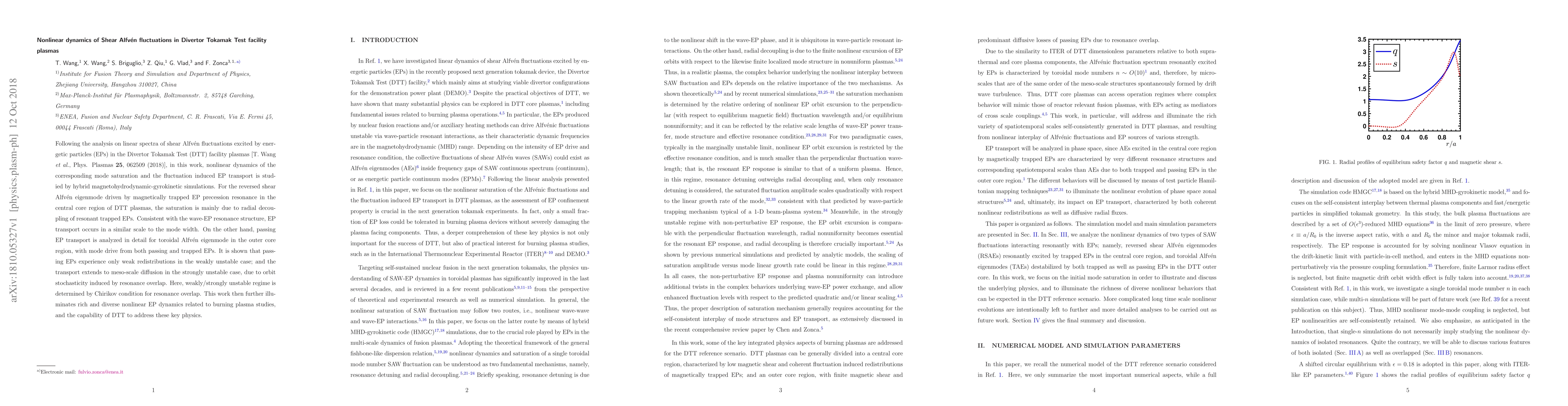 This paper investigates nonlinear dynamics of shear Alfvén fluctuations in Divertor Tokamak Test facility plasmas, focusing on mode saturation and energetic particle (EP) transport via hybrid simulations. It finds that saturation is due to radial decoupling of trapped EPs, while EP transport scales with mode width, and meso-scale diffusion in strongly unstable regimes is driven by orbit stochasticity from resonance overlap.