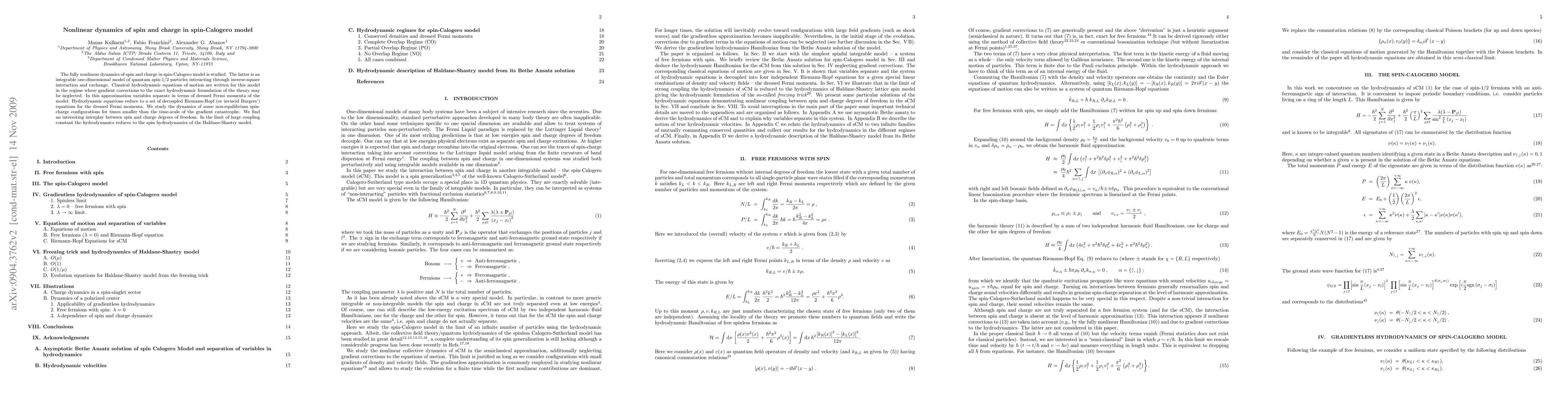 This paper investigates the nonlinear dynamics of spin and charge in the spin-Calogero model, an integrable quantum system of spin-1/2 particles. It derives classical hydrodynamic equations and finds a decoupling into Riemann-Hopf equations for dressed Fermi momenta, revealing an interplay between spin and charge dynamics.