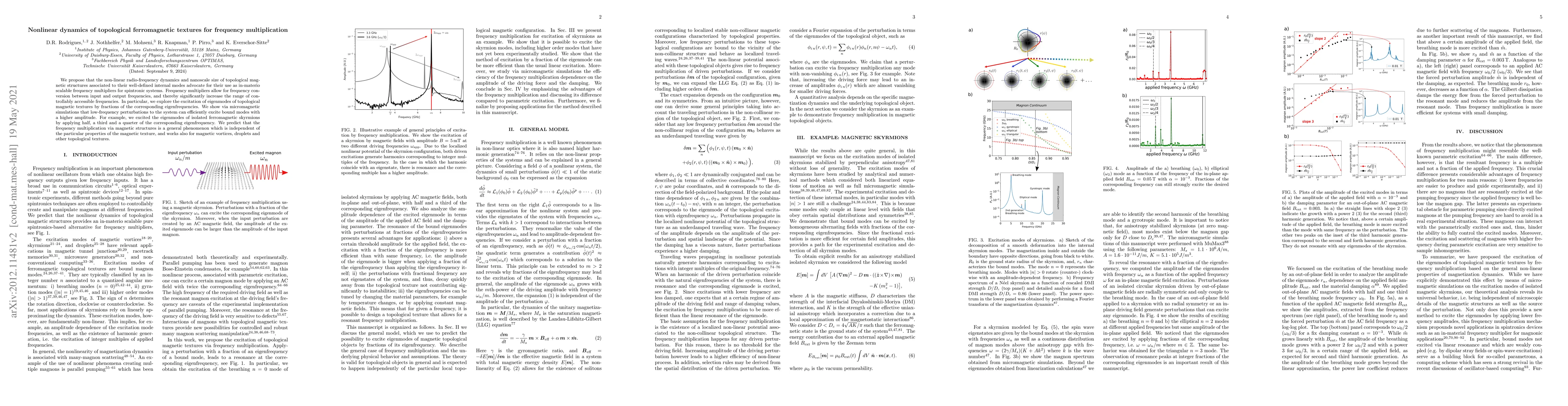 This paper proposes using the nonlinear dynamics of topological magnetic structures, such as skyrmions, as scalable frequency multipliers in spintronic systems. Micromagnetic simulations demonstrate that low-frequency perturbations can efficiently excite higher-frequency eigenmodes, suggesting a general frequency multiplication phenomenon applicable to various magnetic textures.