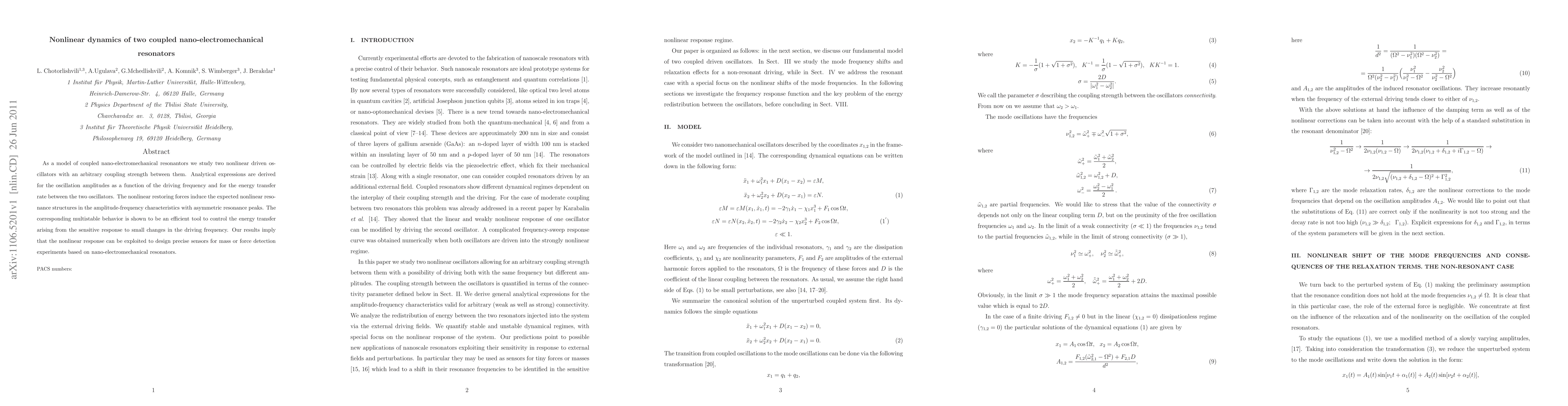 This paper explores the nonlinear dynamics of two coupled nano-electromechanical resonators, deriving analytical expressions for oscillation amplitudes and energy transfer rates. It reveals multistable behavior and asymmetric resonance peaks, suggesting the potential for precise sensors based on sensitive frequency response.