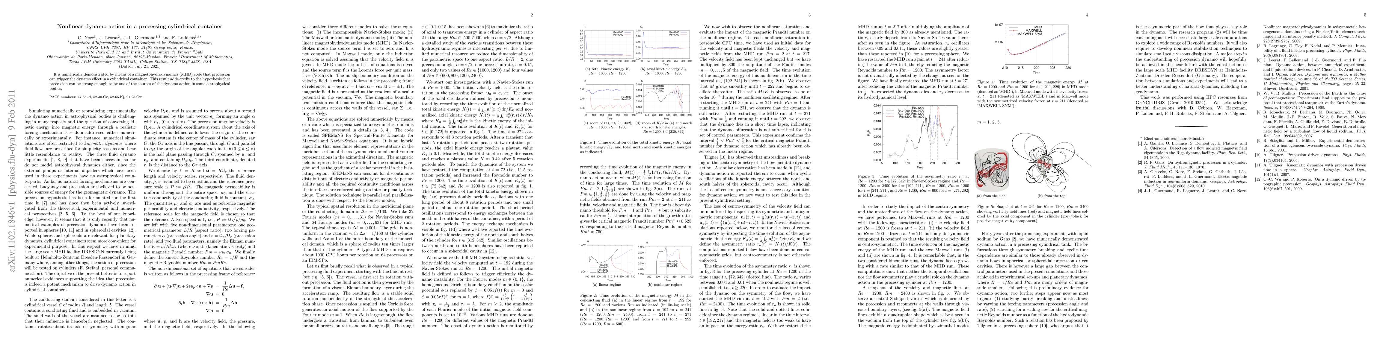 Summary: A numerical MHD study reveals that precession can induce dynamo action in a cylindrical container, supporting the hypothesis that precession may serve as a significant dynamo source in certain astrophysical bodies.