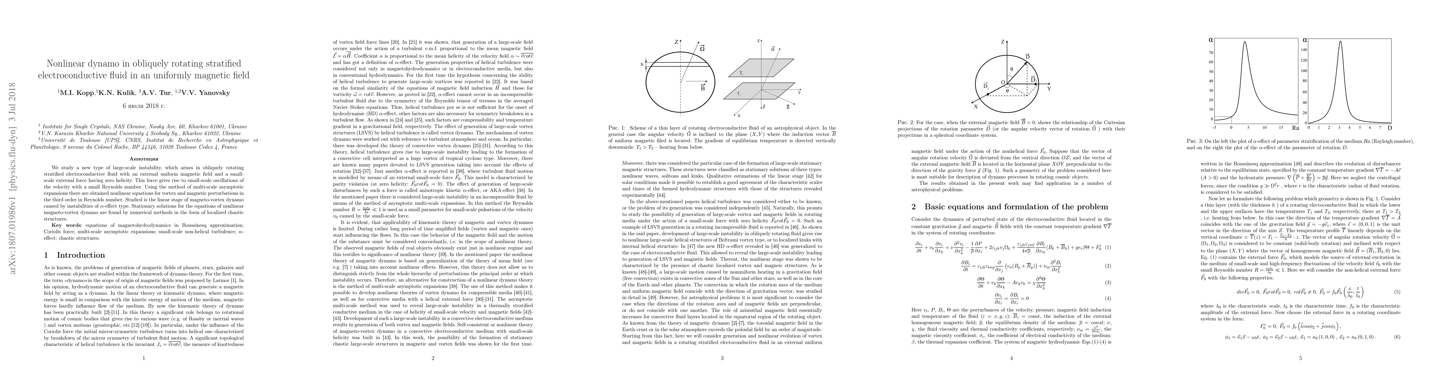 This paper investigates a nonlinear dynamo instability in obliquely rotating, stratified, electroconductive fluid under a uniform magnetic field, driven by small-scale oscillations from a helicity-zero external force. Nonlinear equations for vortex and magnetic perturbations are derived, and numerical methods reveal localized chaotic structures as stationary solutions.