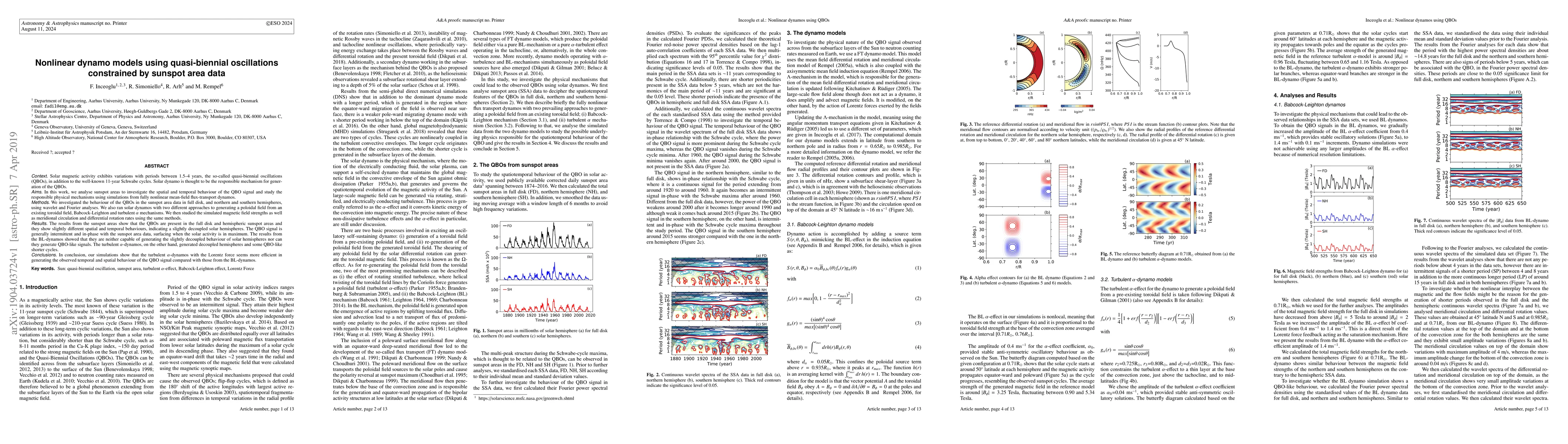 Contex: Solar magnetic activity exhibits variations with periods between 1.5--4 years, the so-called quasi-biennial oscillations (QBOs), in addition to the well-known 11-year Schwabe cycles. Solar dynamo is thought to be the responsible mechanism for generation of the QBOs. Aims: In this work, we analyse sunspot areas to investigate the spatial and temporal behaviour of the QBO signal and study the responsible physical mechanisms using simulations from fully nonlinear mean-field flux-transport dynamos. Methods: We investigated the behaviour of the QBOs in the sunspot area data in full disk, and northern and southern hemispheres, using wavelet and Fourier analyses. We also ran solar dynamos with two different approaches to generating a poloidal field from an existing toroidal field, Babcock-Leighton and turbulent $\alpha$ mechanisms. We then studied the simulated magnetic field strengths as well as meridional circulation and differential rotation rates using the same methods. Results: The results from the sunspot areas show that the QBOs are present in the full disk and hemispheric sunspot areas and they show slightly different spatial and temporal behaviours, indicating a slightly decoupled solar hemispheres. The QBO signal is generally intermittent and in-phase with the sunspot area data, surfacing when the solar activity is in maximum. The results from the BL-dynamos showed that they are neither capable of generating the slightly decoupled behaviour of solar hemispheres nor can they generate QBO-like signals. The turbulent $\alpha$-dynamos, on the other hand, generated decoupled hemispheres and some QBO-like shorter cycles. Conclusions: In conclusion, our simulations show that the turbulent $\alpha$-dynamos with the Lorentz force seems more efficient in generating the observed temporal and spatial behaviour of the QBO signal compared with those from the BL-dynamos.