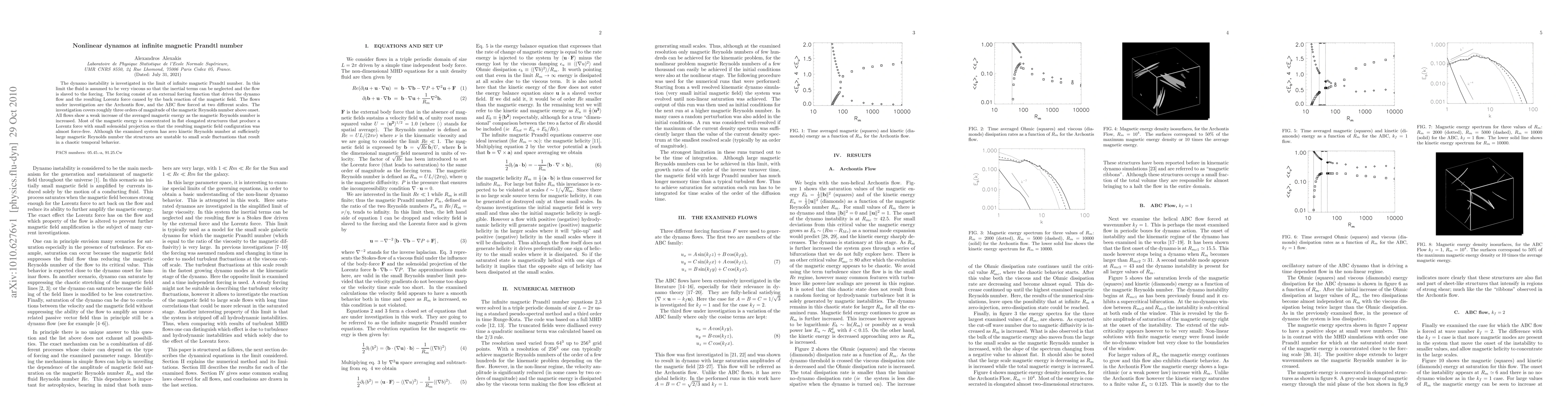 This study examines dynamo instability at infinite magnetic Prandtl number, finding weak magnetic energy increase with higher magnetic Reynolds number. Magnetic field configurations are nearly force-free, with structures showing unpredictable temporal behavior despite zero kinetic Reynolds number at large magnetic Reynolds numbers.