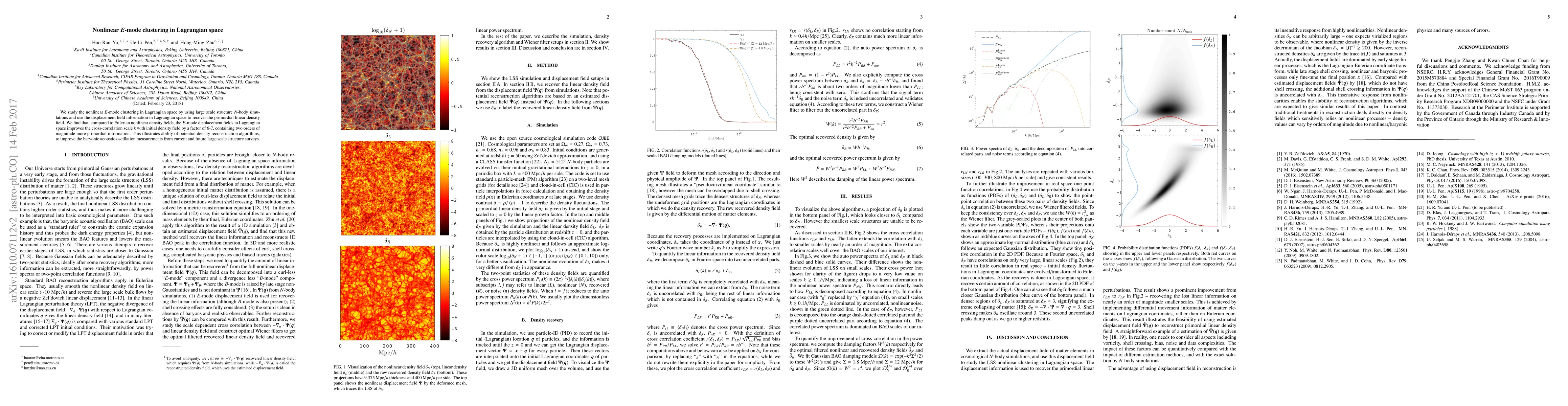 This paper investigates nonlinear $E$-mode clustering in Lagrangian space using large-scale structure $N$-body simulations, revealing that $E$-mode displacement fields provide a significantly better cross-correlation with the initial density field compared to Eulerian nonlinear density fields, enhancing primordial information by two orders of magnitude. This suggests improved potential for reconstructing density and baryonic acoustic oscillation measurements in future surveys.