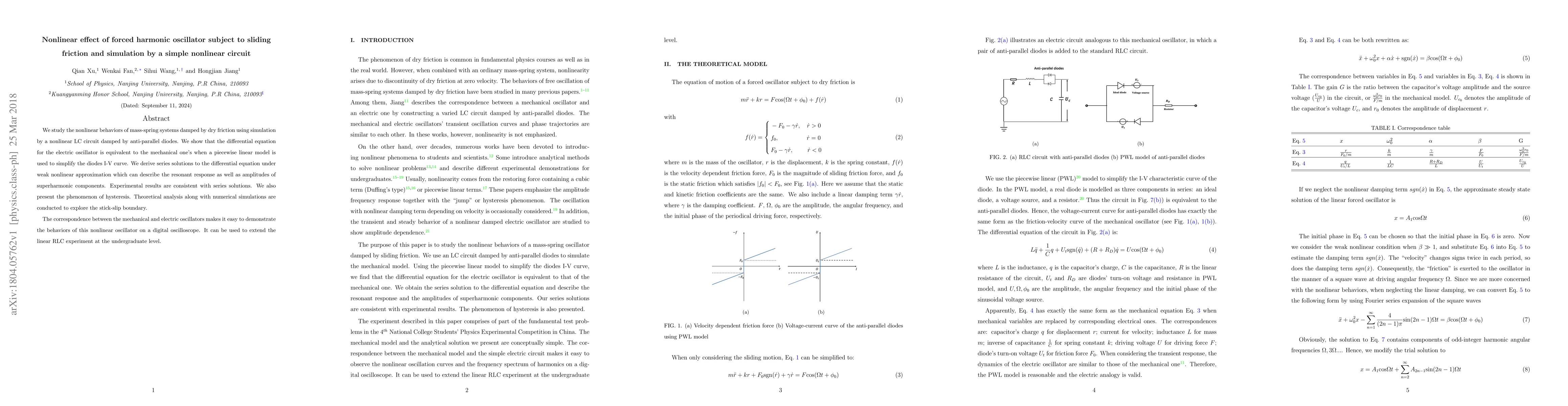 This research demonstrates the equivalence between mechanical mass-spring systems with dry friction and a nonlinear LC electrical circuit damped by anti-parallel diodes. The study derives series solutions to describe oscillator behavior, validates them with experiments, and explores stick-slip boundaries, offering an educational tool for enhancing undergraduate RLC circuit experiments.