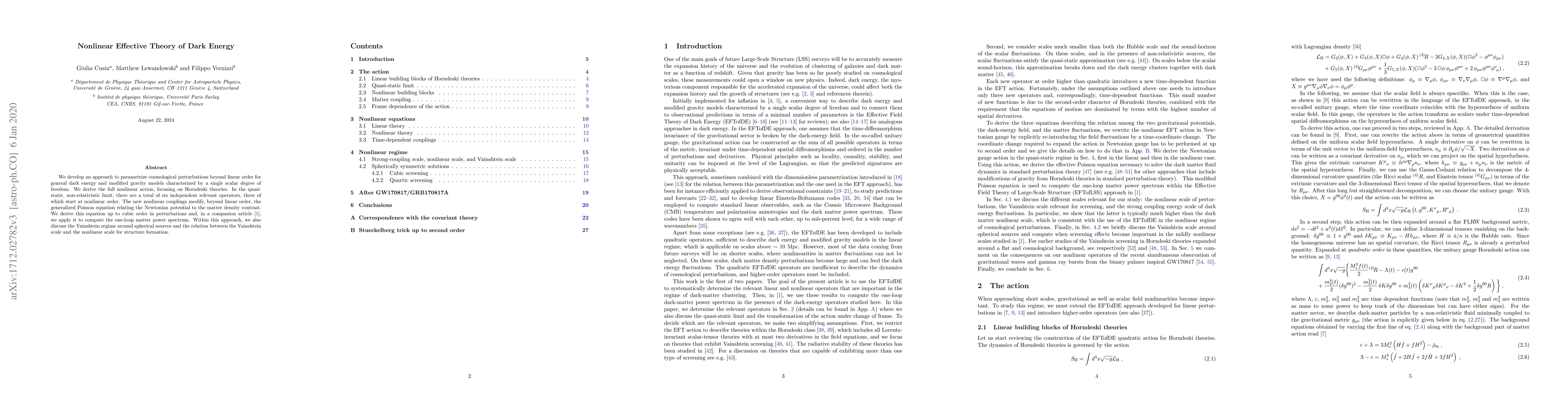 We develop an approach to parametrize cosmological perturbations beyond linear order for general dark energy and modified gravity models characterized by a single scalar degree of freedom. We derive the full nonlinear action, focusing on Horndeski theories. In the quasi-static, non-relativistic limit, there are a total of six independent relevant operators, three of which start at nonlinear order. The new nonlinear couplings modify, beyond linear order, the generalized Poisson equation relating the Newtonian potential to the matter density contrast. We derive this equation up to cubic order in perturbations and, in a companion article, we apply it to compute the one-loop matter power spectrum. Within this approach, we also discuss the Vainshtein regime around spherical sources and the relation between the Vainshtein scale and the nonlinear scale for structure formation.