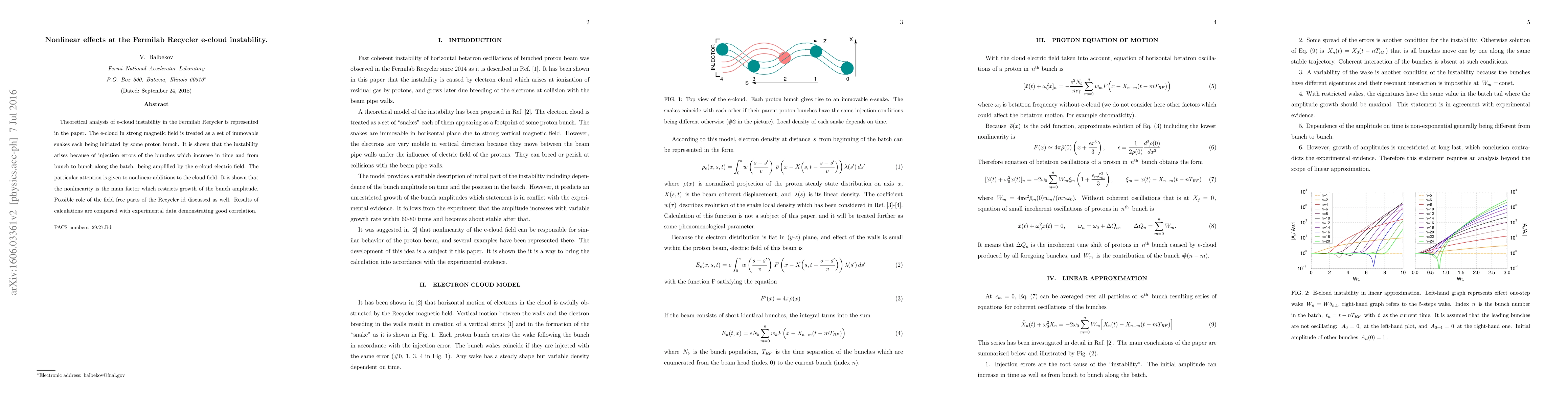 This paper investigates the e-cloud instability in the Fermilab Recycler, attributing it to injection errors amplified by the e-cloud electric field. Nonlinear effects are identified as the primary factor limiting the growth of bunch amplitude, with results showing good correlation with experimental data.