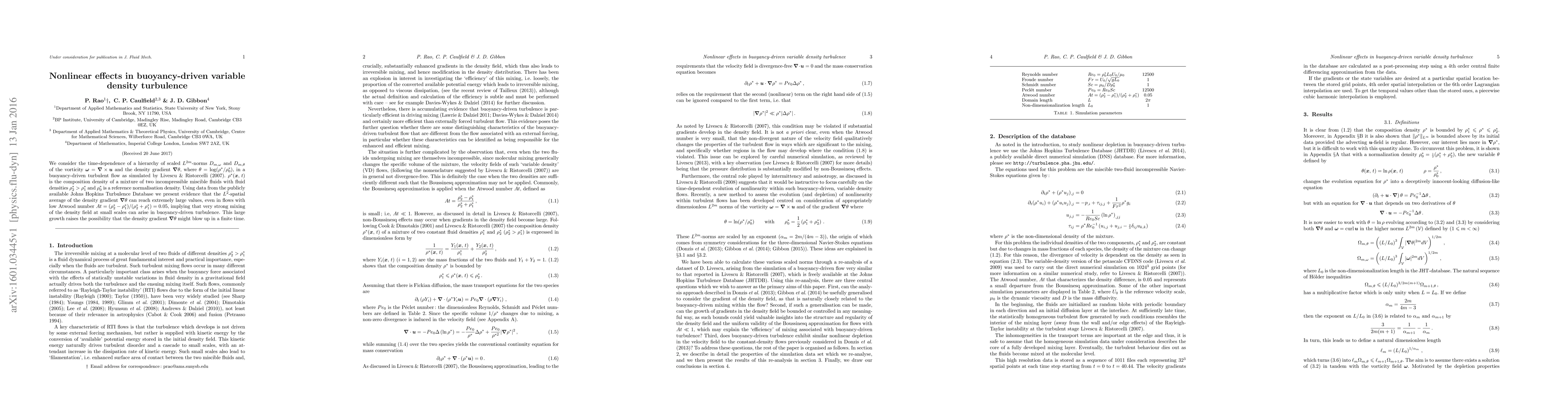 This study investigates the nonlinear effects in buoyancy-driven turbulence, focusing on the time-dependence of vorticity and density gradient norms. It finds that even in low Atwood number flows, the density gradient can attain extremely large values, suggesting strong small-scale mixing and potential finite-time blow-up.
