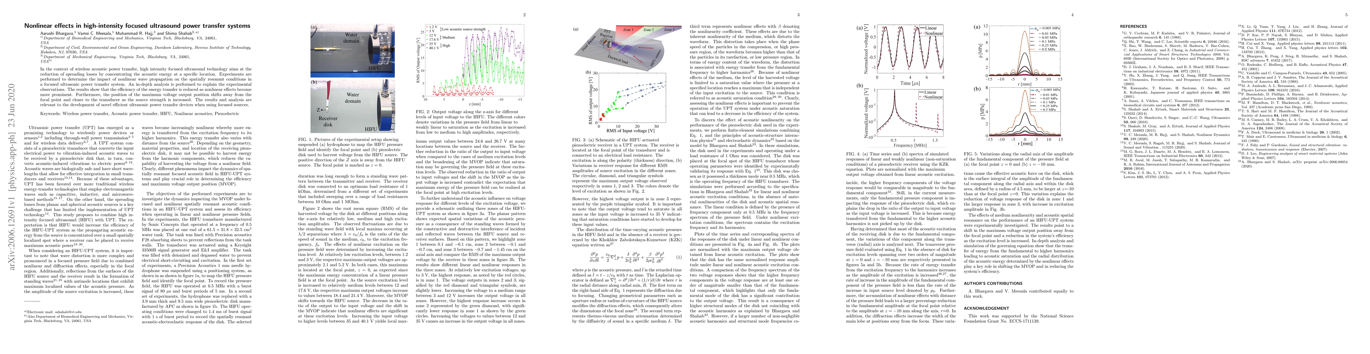 This paper explores the nonlinear wave propagation effects in high-intensity focused ultrasound systems for wireless acoustic power transfer. It finds that increased nonlinear effects reduce energy transfer efficiency and shift the maximum voltage output position closer to the transducer, providing insights for developing efficient ultrasonic power transfer devices.