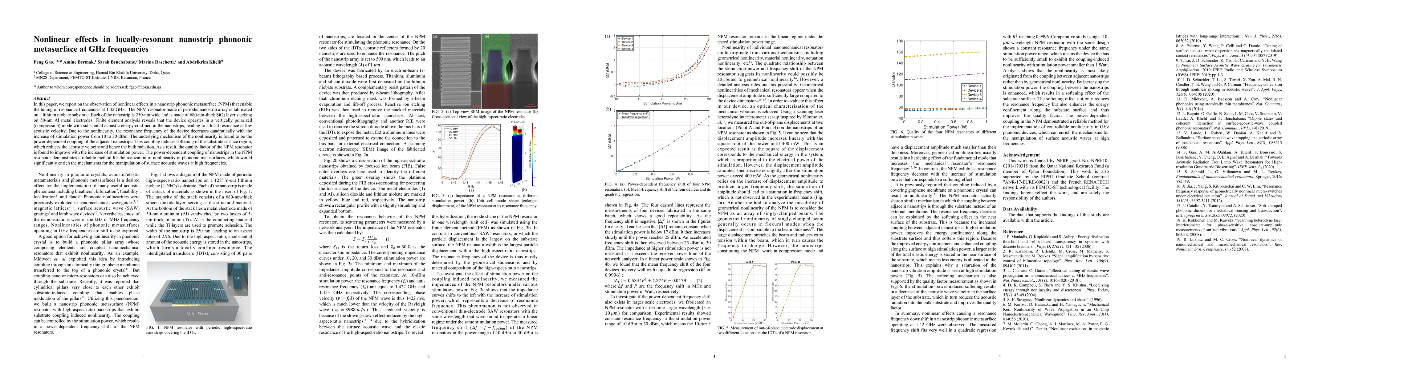 In this paper, we report on the observation of nonlinear effects in a nanostrip phononic metasurface (NPM) that enable the tuning of resonance frequencies at 1.42 GHz. The NPM resonator made of periodic nanostrip array is fabricated on a lithium niobate substrate. Each of the nanostrip is 250-nm wide and is made of 680-nm-thick SiO2 layer stacking on 50-nm Al metal electrodes. Finite element analysis reveals that the device operates in a vertically polarized (compression) mode with substantial acoustic energy confined in the nanostrips, leading to a local resonance at low acoustic velocity. Due to the nonlinearity, the resonance frequency of the device decreases quadratically with the increase of stimulation power from 10 to 30 dBm. The underlying mechanism of the nonlinearity is found to be the power-dependent coupling of the adjacent nanostrips. This coupling induces softening of the substrate surface region, which reduces the acoustic velocity and hence the bulk radiation. As a result, the quality factor of the NPM resonator is found to improve with the increase of stimulation power. The power-dependent coupling of nanostrips in the NPM resonator demonstrates a reliable method for the realization of nonlinearity in phononic metasurfaces, which would significantly enrich the mechanisms for the manipulation of surface acoustic waves at high frequencies.