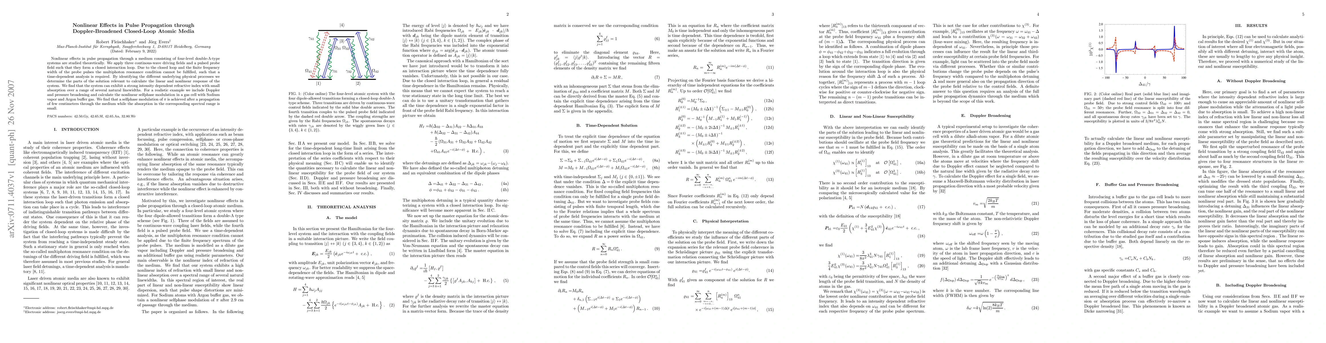This paper investigates nonlinear effects in pulse propagation through Doppler-broadened closed-loop atomic media, focusing on four-level double-$\Lambda$-type systems. It reveals that the system can exhibit a strong intensity-dependent refractive index with minimal absorption over several natural linewidths, achieving significant nonlinear self-phase modulation in a gas cell with Sodium vapor and Argon buffer gas.
