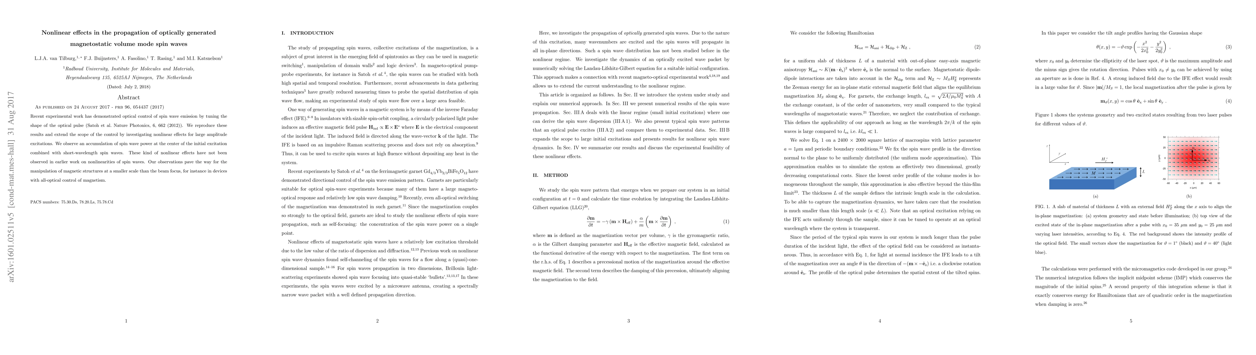 Recent experimental work has demonstrated optical control of spin wave emission by tuning the shape of the optical pulse (Satoh et al.\ Nature Photonics, 6, 662 (2012)). We reproduce these results and extend the scope of the control by investigating nonlinear effects for large amplitude excitations. We observe an accumulation of spin wave power at the center of the initial excitation combined with short-wavelength spin waves. These kind of nonlinear effects have not been observed in earlier work on nonlinearities of spin waves. Our observations pave the way for the manipulation of magnetic structures at a smaller scale than the beam focus, for instance in devices with all-optical control of magnetism.