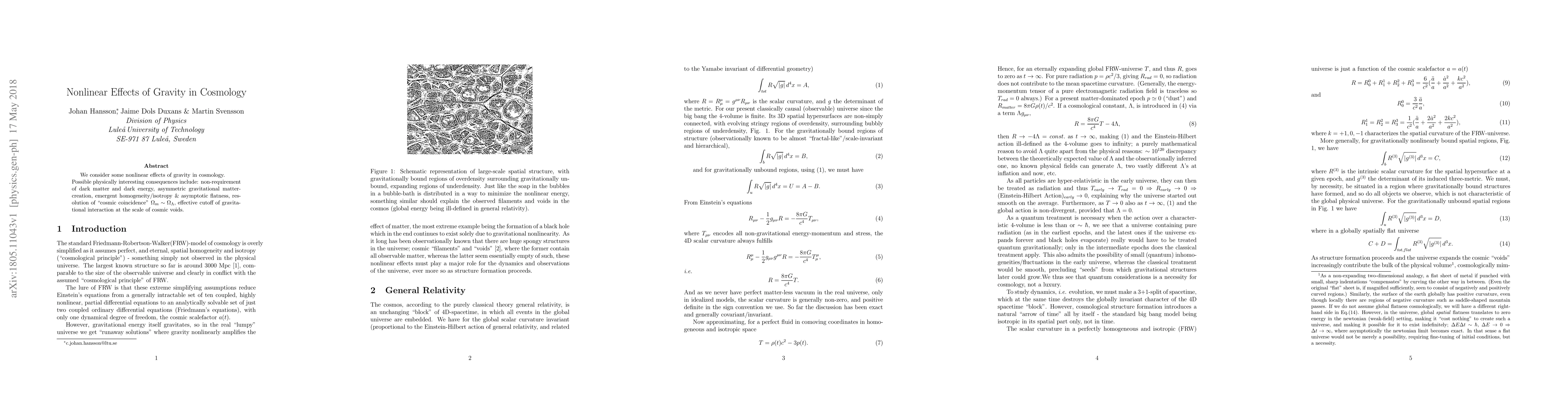 We consider some nonlinear effects of gravity in cosmology. Possible physically interesting consequences include: non-requirement of dark matter and dark energy, asymmetric gravitational matter-creation, emergent homogeneity/isotropy & asymptotic flatness, resolution of "cosmic coincidence" Omega_m \sim Omega_lambda, effective cutoff of gravitational interaction at the scale of cosmic voids.
