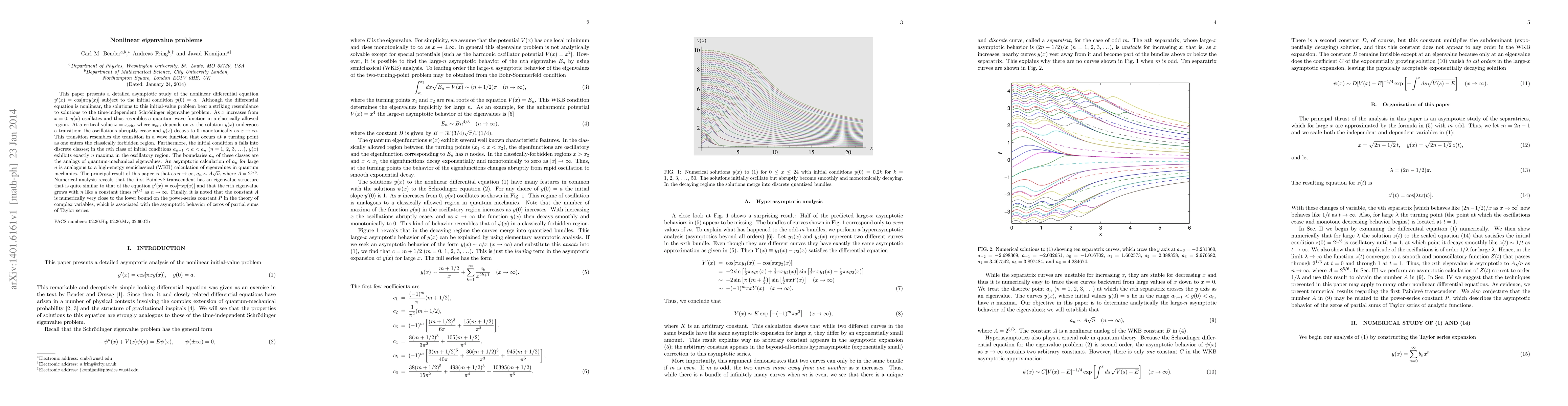 This paper presents a detailed asymptotic study of the nonlinear differential equation y'(x)=\cos[\pi xy(x)] subject to the initial condition y(0)=a. Although the differential equation is nonlinear, the solutions to this initial-value problem bear a striking resemblance to solutions to the time-independent Schroedinger eigenvalue problem. As x increases from x=0, y(x) oscillates and thus resembles a quantum wave function in a classically allowed region. At a critical value x=x_{crit}, where x_{crit} depends on a, the solution y(x) undergoes a transition; the oscillations abruptly cease and y(x) decays to 0 monotonically as x-->\infty. This transition resembles the transition in a wave function that occurs at a turning point as one enters the classically forbidden region. Furthermore, the initial condition a falls into discrete classes; in the nth class of initial conditions a_{n-1}\infty, a_n~A\sqrt{n}, where A=2^{5/6}. Numerical analysis reveals that the first Painleve transcendent has an eigenvalue structure that is quite similar to that of the equation y'(x)=\cos[\pi xy(x)] and that the nth eigenvalue grows with n like a constant times n^{3/5} as n-->\infty. Finally, it is noted that the constant A is numerically very close to the lower bound on the power-series constant P in the theory of complex variables, which is associated with the asymptotic behavior of zeros of partial sums of Taylor series.