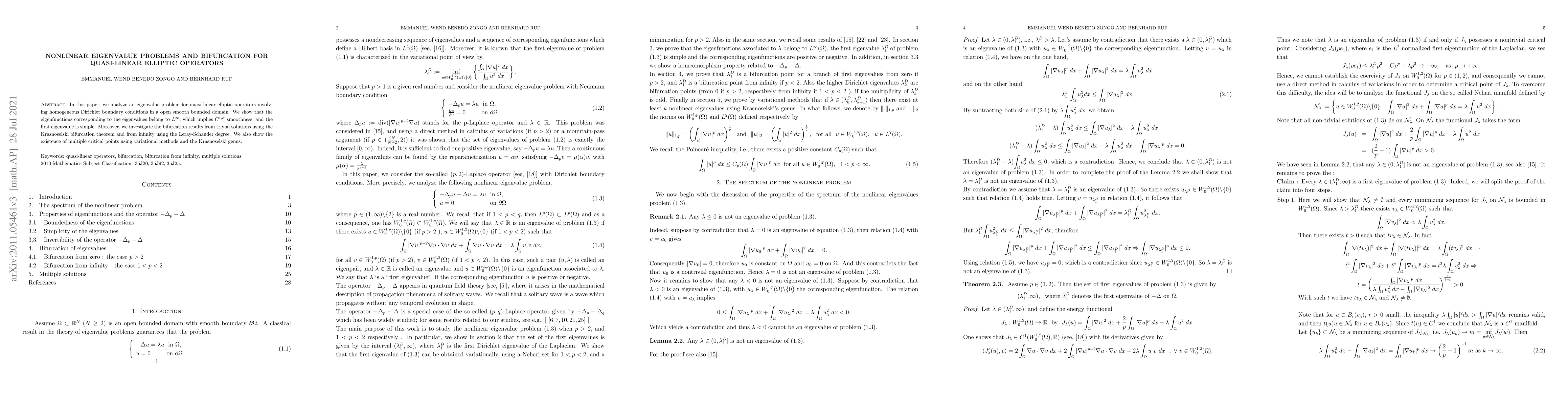 This paper studies eigenvalue problems for quasi-linear elliptic operators with homogeneous Dirichlet conditions, proving eigenfunctions' $L^{\infty}$ membership and $C^{1,\alpha}$ smoothness. It also explores bifurcation phenomena using the Krasnoselski theorem and Leray-Schauder degree, and demonstrates multiple critical points via variational methods and the Krasnoselski genus.