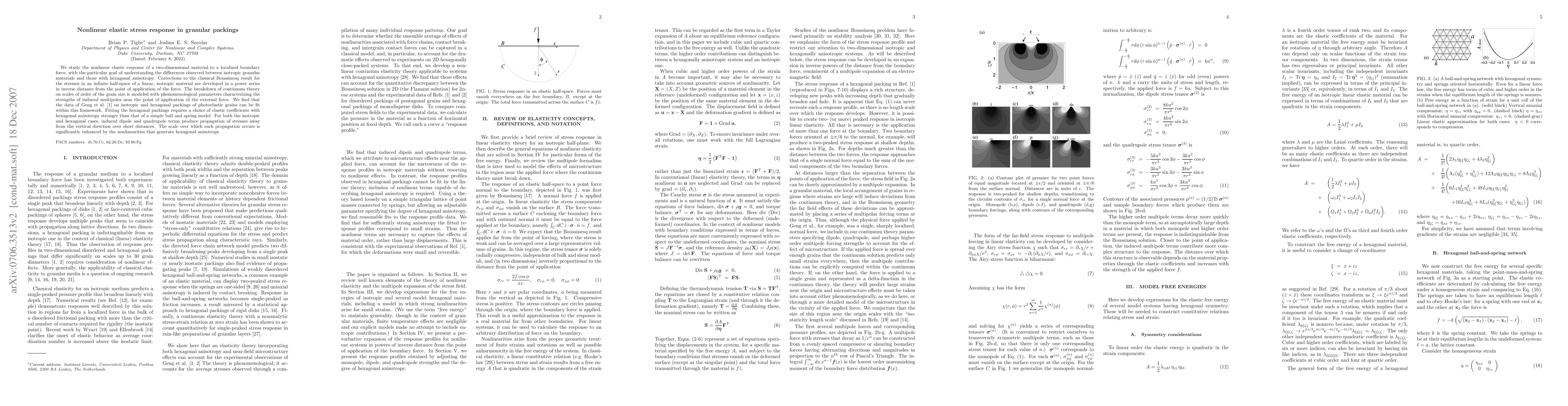 We study the nonlinear elastic response of a two-dimensional material to a localized boundary force, with the particular goal of understanding the differences observed between isotropic granular materials and those with hexagonal anisotropy. Corrections to the classical Boussinesq result for the stresses in an infinite half-space of a linear, isotropic material are developed in a power series in inverse distance from the point of application of the force. The breakdown of continuum theory on scales of order of the grain size is modeled with phenomenological parameters characterizing the strengths of induced multipoles near the point of application of the external force. We find that the data of Geng et al. on isotropic and hexagonal packings of photoelastic grains can be fit within this framework. Fitting the hexagonal packings requires a choice of elastic coefficients with hexagonal anisotropy stronger than that of a simple ball and spring model. For both the isotropic and hexagonal cases, induced dipole and quadrupole terms produce propagation of stresses away from the vertical direction over short distances. The scale over which such propagation occurs is significantly enhanced by the nonlinearities that generate hexagonal anisotropy.