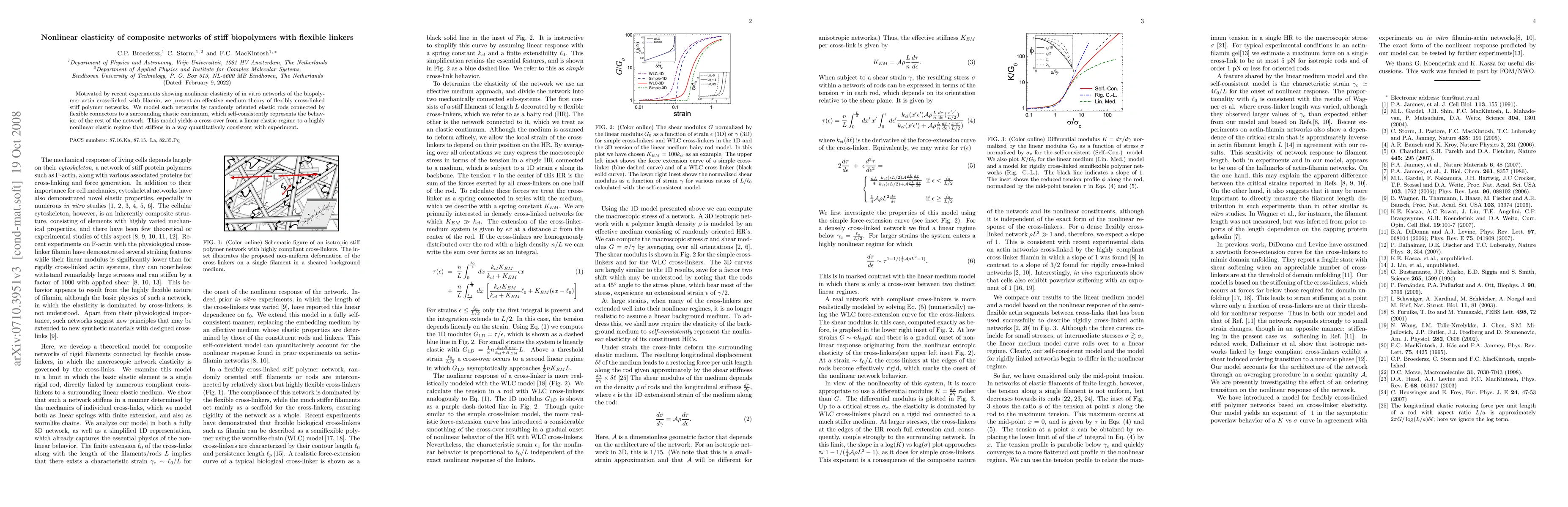 Summary: This paper develops a theoretical model to describe the nonlinear elasticity of composite networks of stiff biopolymers like actin cross-linked with flexible linkers like filamin, showing a transition from linear to highly nonlinear elastic behavior consistent with experimental observations.