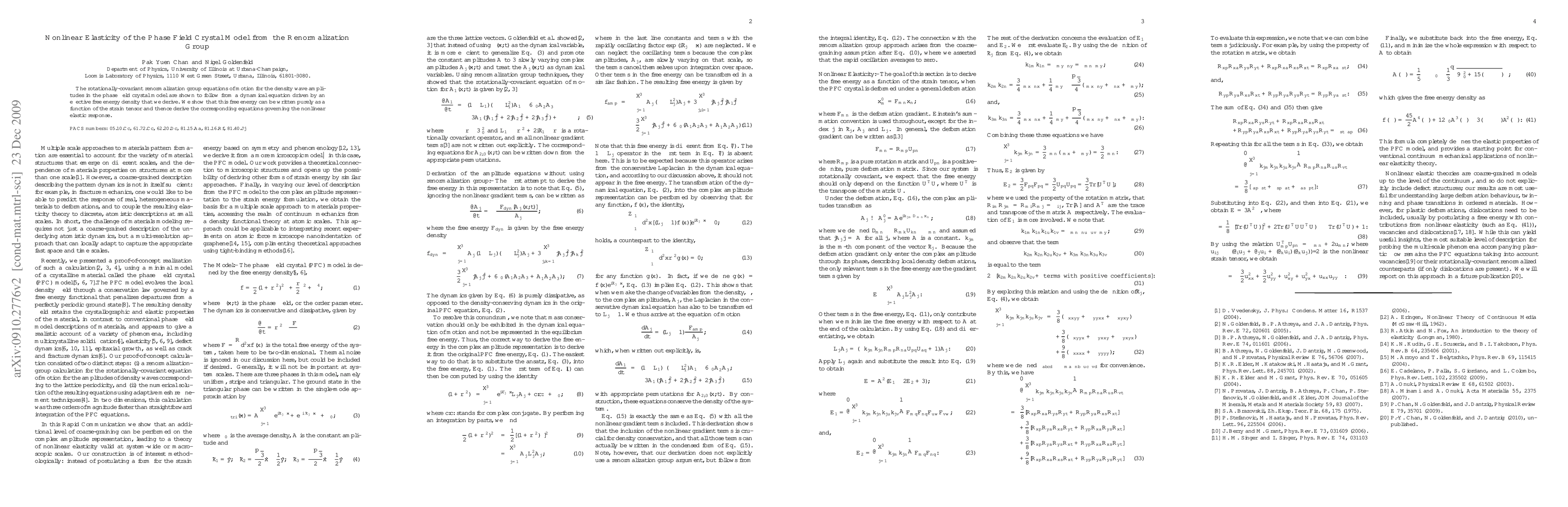 This paper derives the renormalization group equations for the phase field crystal model, showing that they arise from a dynamical equation based on an effective free energy density dependent solely on the strain tensor. The study then formulates the nonlinear elastic response equations from this derived free energy.