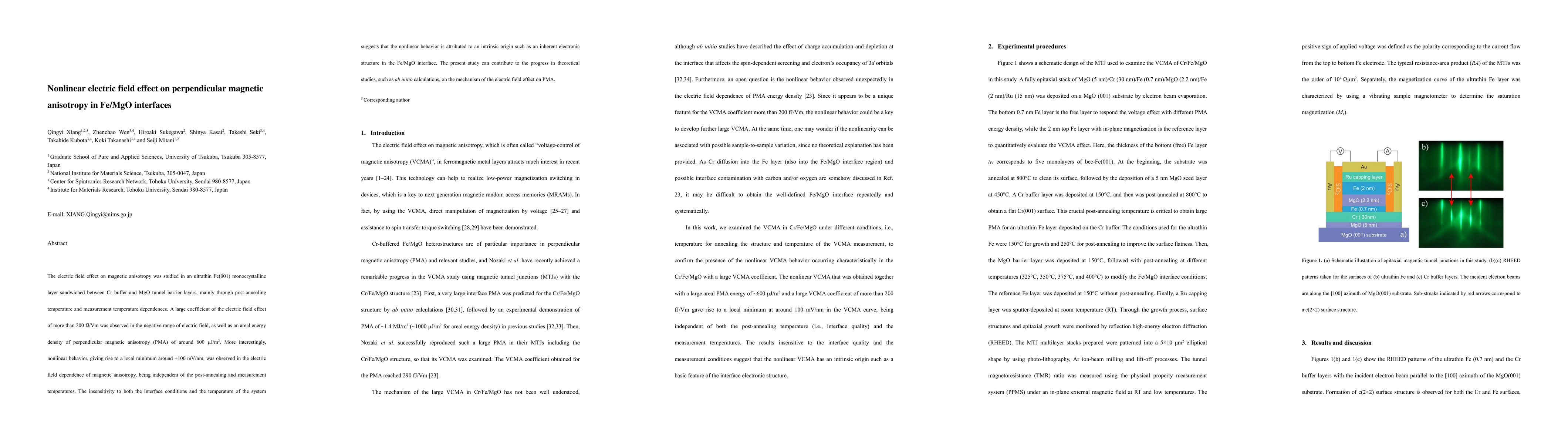 This study investigates the electric field effect on perpendicular magnetic anisotropy in Fe/MgO interfaces, revealing a large electric field effect coefficient and nonlinear behavior in the electric field dependence of magnetic anisotropy, independent of temperature and interface conditions, suggesting intrinsic electronic structure origins.