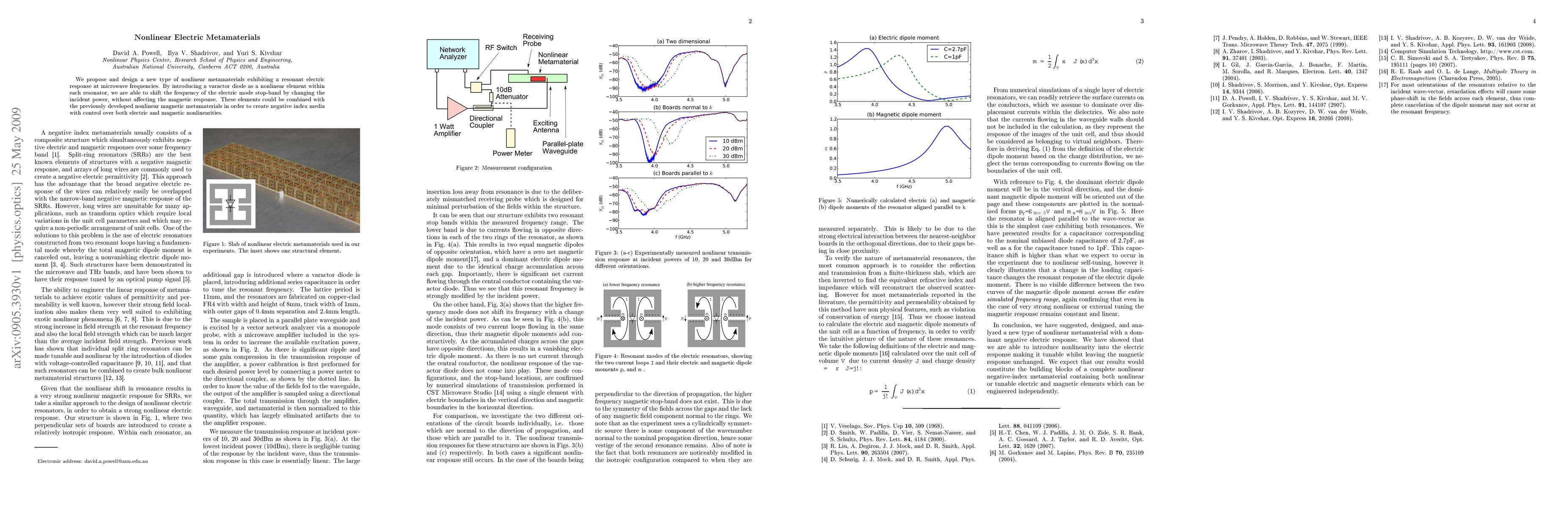 We propose and design a new type of nonlinear metamaterials exhibiting a resonant electric response at microwave frequencies. By introducing a varactor diode as a nonlinear element within each resonator, we are able to shift the frequency of the electric mode stop-band by changing the incident power, without affecting the magnetic response. These elements could be combined with the previously developed nonlinear magnetic metamaterials in order to create negative index media with control over both electric and magnetic nonlinearities.