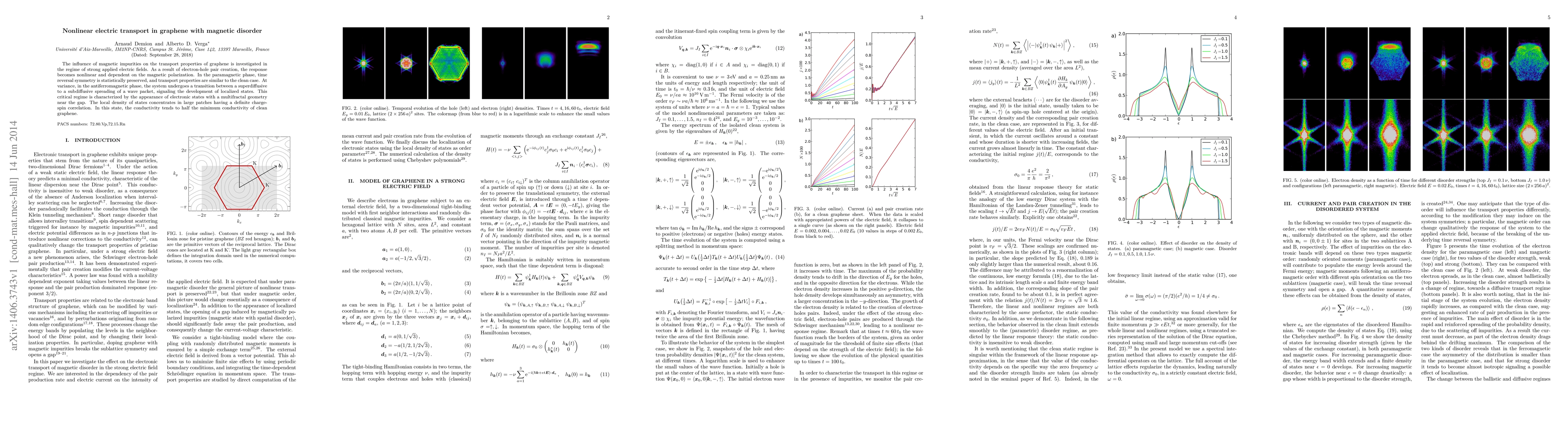 The influence of magnetic impurities on the transport properties of graphene is investigated in the regime of strong applied electric fields. As a result of electron-hole pair creation, the response becomes nonlinear and dependent on the magnetic polarization. In the paramagnetic phase, time reversal symmetry is statistically preserved, and transport properties are similar to the clean case. At variance, in the antiferromagnetic phase, the system undergoes a transition between a superdiffusive to a subdiffusive spreading of a wave packet, signaling the development of localized states. This critical regime is characterized by the appearance of electronic states with a multifractal geometry near the gap. The local density of states concentrates in large patches having a definite charge-spin correlation. In this state, the conductivity tends to half the minimum conductivity of clean graphene.