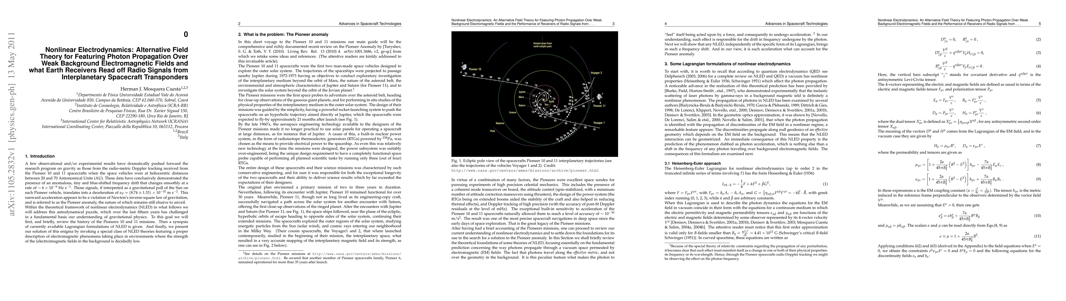 A few observational and/or experimental results have dramatically pushed forward the research program on gravity as those from the radio-metric Doppler tracking received from the Pioneer 10 and 11 spacecrafts when the space vehicles were at heliocentric distances between 20 and 70 Astronomical Units (AU). These data have conclusively demonstrated the presence of an anomalous, tiny and blue-shifted frequency drift that changes smoothly at a rate of $ \sim 6 \times 10^{-9}$ Hz s$^{-1}$. Those signals, if interpreted as a gravitational pull of the Sun on each Pioneer vehicle, translates into a deceleration of $a_P = (8.74\pm 1.33) \times 10^{-10}$ m s$^{-2}$. This Sunward acceleration appears to be a violation of Newton's inverse-square law of gravitation, and is referred to as the Pioneer anomaly, the nature of which remains still elusive to unveil. Within the theoretical framework of nonlinear electrodynamics (NLED) in what follows we will address this astrodynamics puzzle, which over the last fifteen years has challenged in a fundamental basis our understanding of gravitational physics. To this goal we will first, and briefly, review the history of the Pioneers 10 and 11 missions. Then a synopsis of currently available Lagrangian formulations of NLED is given. And finally, we present our solution of this enigma by invoking a special class of NLED theories featuring a proper description of electromagnetic phenomena taking place in environments where the strength of the (electro)magnetic fields in the background is decidedly low.