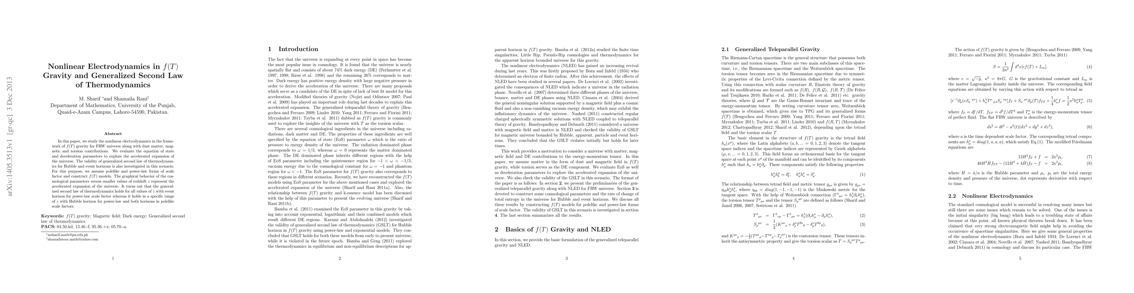 In this paper, we study the nonlinear electrodynamics in the framework of $f(T)$ gravity for FRW universe along with dust matter, magnetic and torsion contributions. We evaluate the equation of state and deceleration parameters to explore the accelerated expansion of the universe. The validity of generalized second law of thermodynamics for Hubble and event horizons is also investigated in this scenario. For this purpose, we assume pole-like and power-law forms of scale factor and construct $f(T)$ models. The graphical behavior of the cosmological parameters versus smaller values of redshift $z$ represent the accelerated expansion of the universe. It turns out that the generalized second law of thermodynamics holds for all values of $z$ with event horizon for power-law scale factor whereas it holds in a specific range of $z$ with Hubble horizon for power-law and both horizons in pole-like scale factors.
