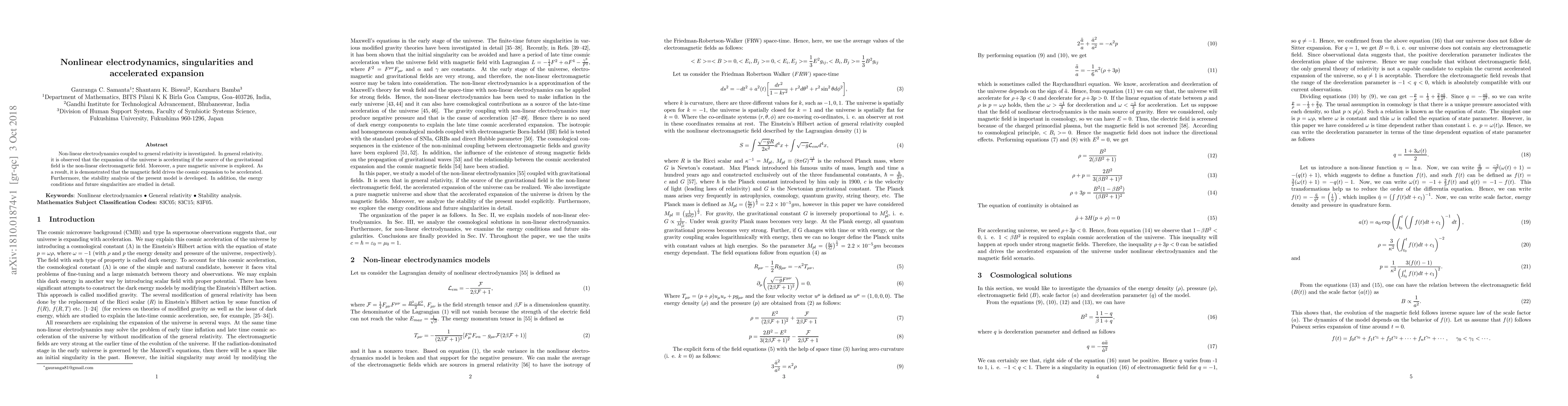 This paper explores non-linear electrodynamics in the context of general relativity, demonstrating that a non-linear electromagnetic field can drive accelerated cosmic expansion. It also investigates the implications of a pure magnetic universe and examines the stability, energy conditions, and future singularities of the model.