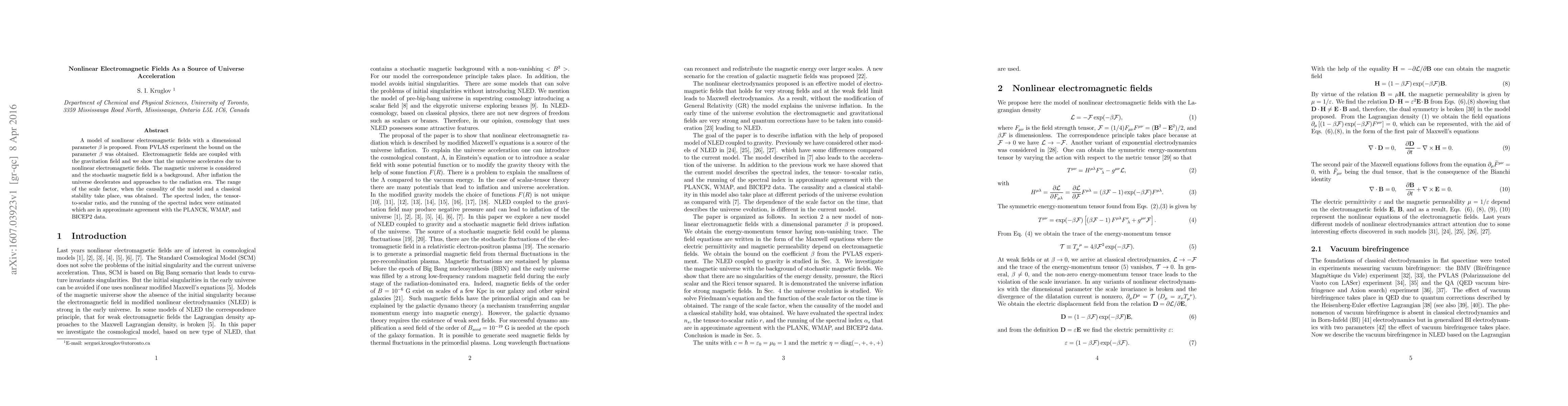 Researchers propose a model linking nonlinear electromagnetic fields to the universe's acceleration, with estimates aligning with PLANCK, WMAP, and BICEP2 data.