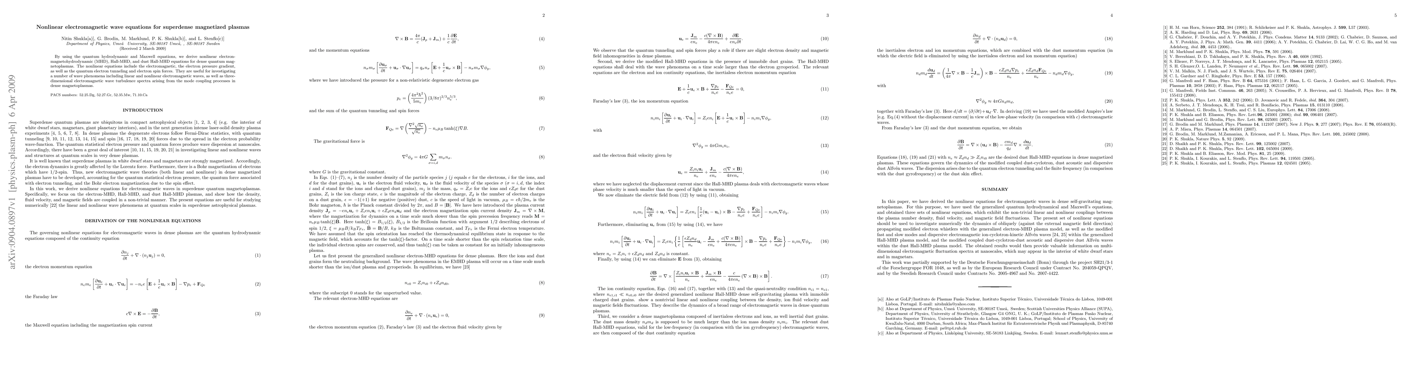 This paper derives nonlinear electromagnetic wave equations for superdense magnetized plasmas, incorporating quantum hydrodynamics, Maxwell's equations, and forces like electron pressure gradients and quantum tunneling. These equations are crucial for studying wave phenomena and electromagnetic wave turbulence in dense magnetoplasmas.