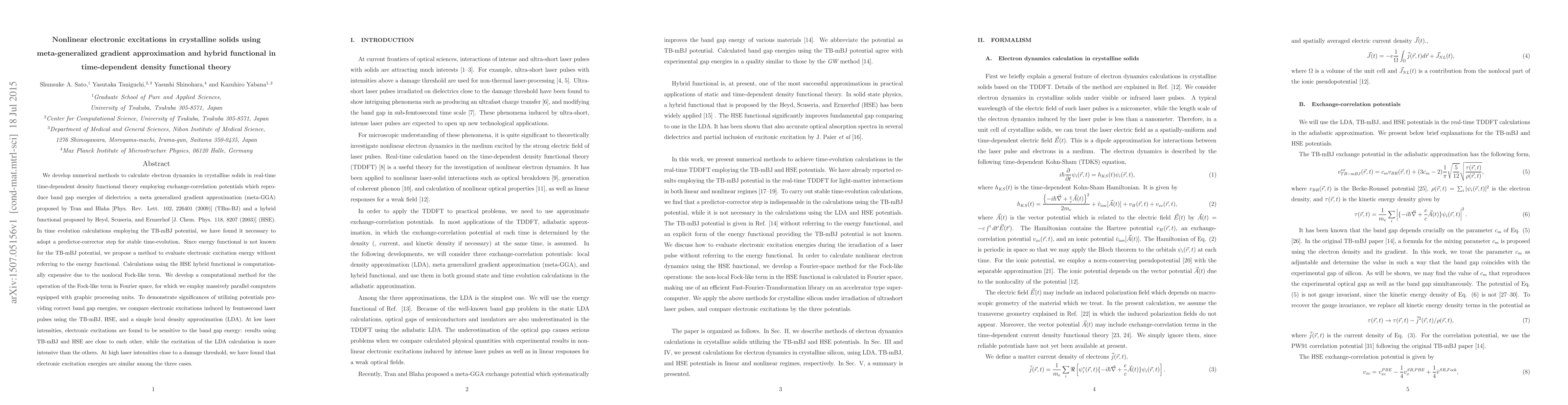 This paper develops numerical methods for real-time electron dynamics in crystalline solids using meta-GGA and hybrid functionals in time-dependent DFT. It introduces a predictor-corrector step for stable time-evolution and proposes a method to evaluate electronic excitation energy without the energy functional. The study highlights the significance of accurate band gap energies in predicting electronic excitations induced by femtosecond laser pulses.