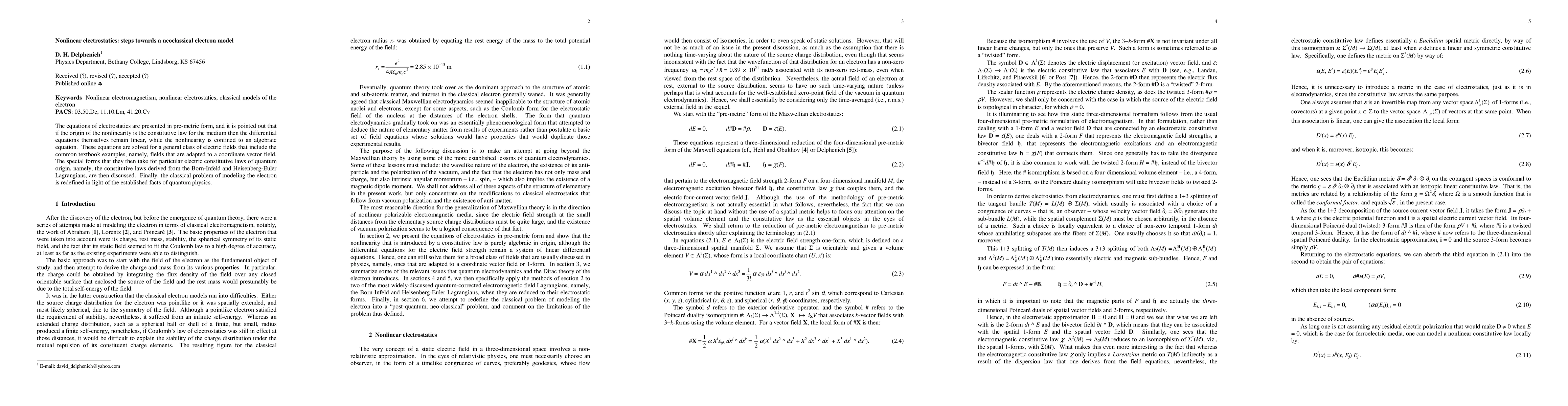 The equations of electrostatics are presented in pre-metric form, and it is pointed out that if the origin of the nonlinearity is the constitutive law for the medium then the differential equations themselves remain linear, while the nonlinearity is confined to an algebraic equation. These equations are solved for a general class of electric fields that include the common textbook examples, namely, fields that are adapted to a coordinate vector field. The special forms that they then take for particular electric constitutive laws of quantum origin, namely, the constitutive laws derived from the Born-Infeld and Heisenberg-Euler Lagrangians, are then discussed. Finally, the classical problem of modeling the electron is redefined in light of the established facts of quantum physics.