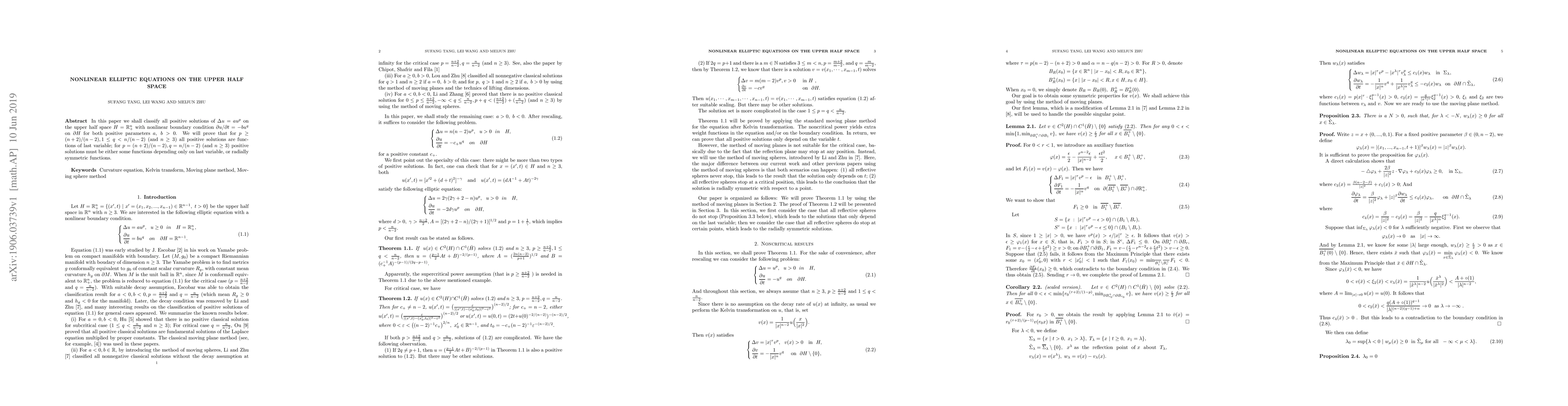 In this paper we shall classify all positive solutions of $ \Delta u =a u^p$ on the upper half space $ H =\Bbb{R}_+^n$ with nonlinear boundary condition $ {\partial u}/{\partial t}= - b u^q $ on $\partial H$ for both positive parameters $a, \ b>0$. We will prove that for $p \ge {(n+2)}/{(n-2)}, 1\leq q<{n}/{(n-2)}$ (and $n \ge 3$) all positive solutions are functions of last variable; for $p= {(n+2)}/{(n-2)}, q= {n}/{(n-2)}$ (and $n \ge 3$) positive solutions must be either some functions depending only on last variable, or radially symmetric functions.