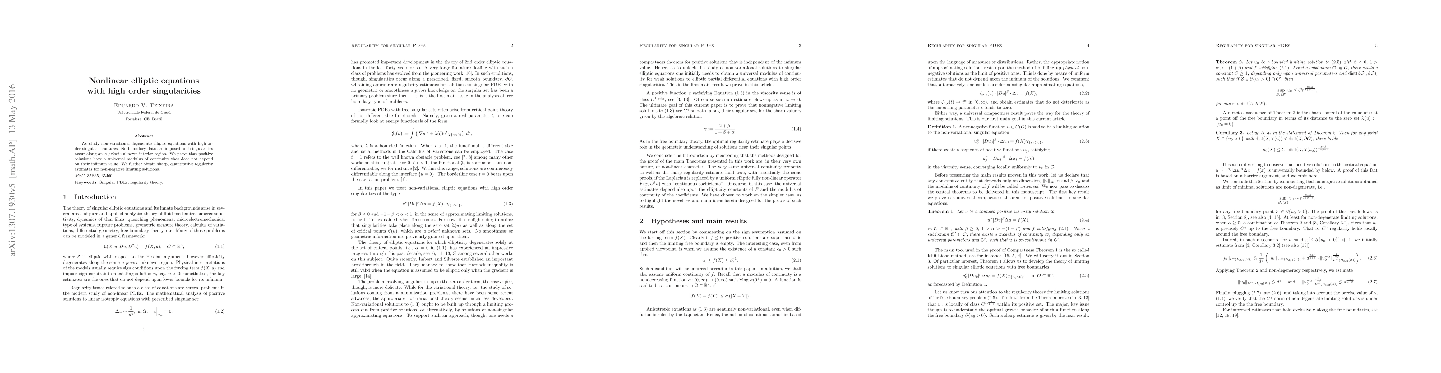 We study non-variational degenerate elliptic equations with high order singular structures. No boundary data are imposed and singularities occur along an {\it a priori} unknown interior region. We prove that positive solutions have a universal modulus of continuity that does not depend on their infimum value. We further obtain sharp, quantitative regularity estimates for non-negative limiting solutions.