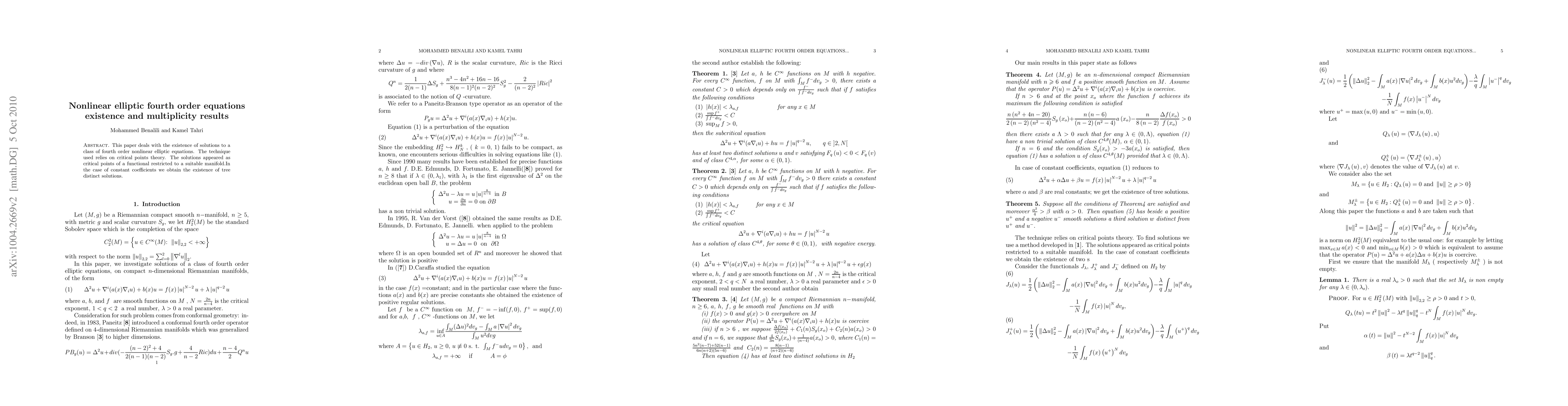 This paper deals with the existence of solutions to a class of fourth order nonlinear elliptic equations. The technique used relies on critical points theory. The solutions appeared as critical points of a functional restricted to a suitable manifold.In the case of constant coefficients we obtain the existence of tree distinct solutions.