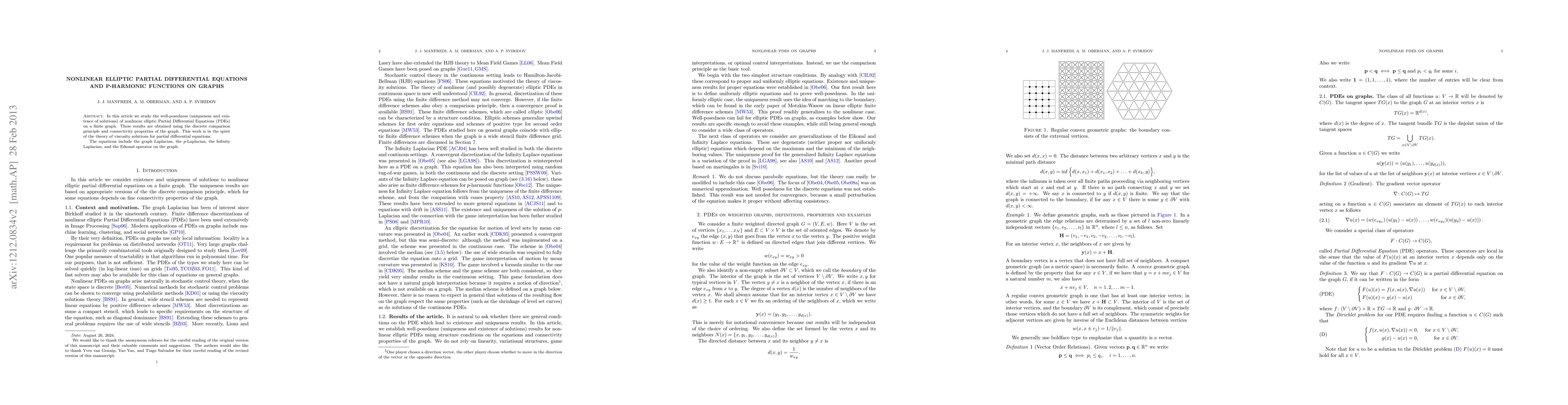 In this article we study the well-posedness (uniqueness and existence of solutions) of nonlinear elliptic Partial Differential Equations (PDEs) on a finite graph. These results are obtained using the discrete comparison principle and connectivity properties of the graph. This work is in the spirit of the theory of viscosity solutions for PDEs. The equations include the graph Laplacian, the $p$-Laplacian, the Infinity Laplacian, the Mean Curvature equation, and the Eikonal operator on the graph.