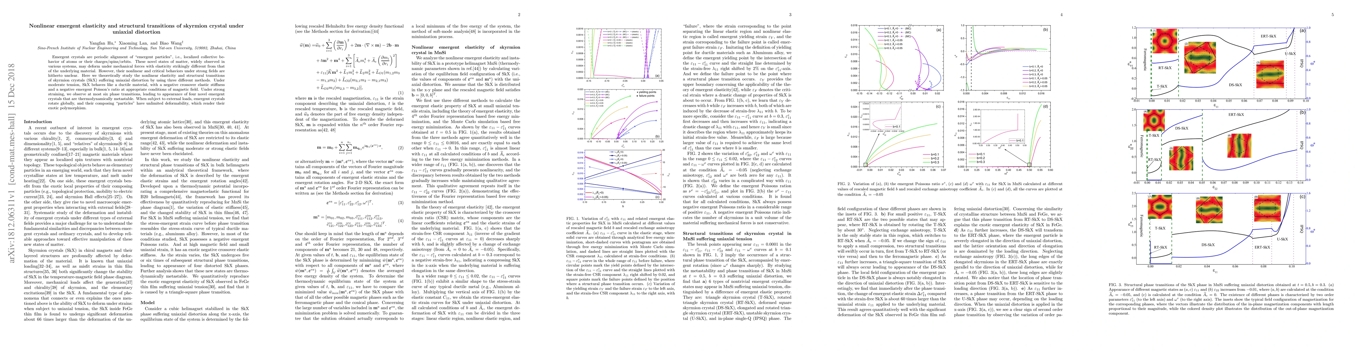 This paper investigates the nonlinear elasticity and structural transitions of skyrmion crystals under uniaxial distortion, revealing ductile behavior under moderate tension and a series of up to six phase transitions under strong strain, resulting in the formation of four novel metastable emergent crystals.