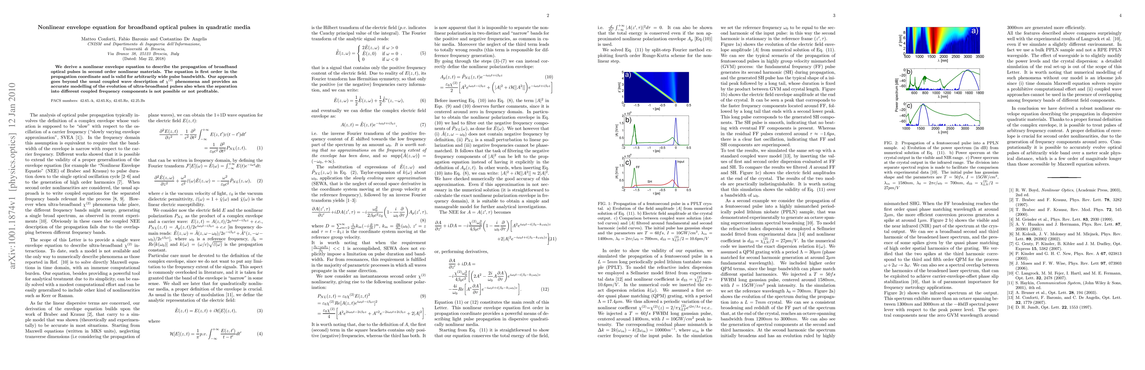 This paper derives a nonlinear envelope equation for broadband optical pulses in quadratic media, offering a first-order model valid for wide pulse bandwidths, which provides an accurate description beyond traditional coupled wave approaches.