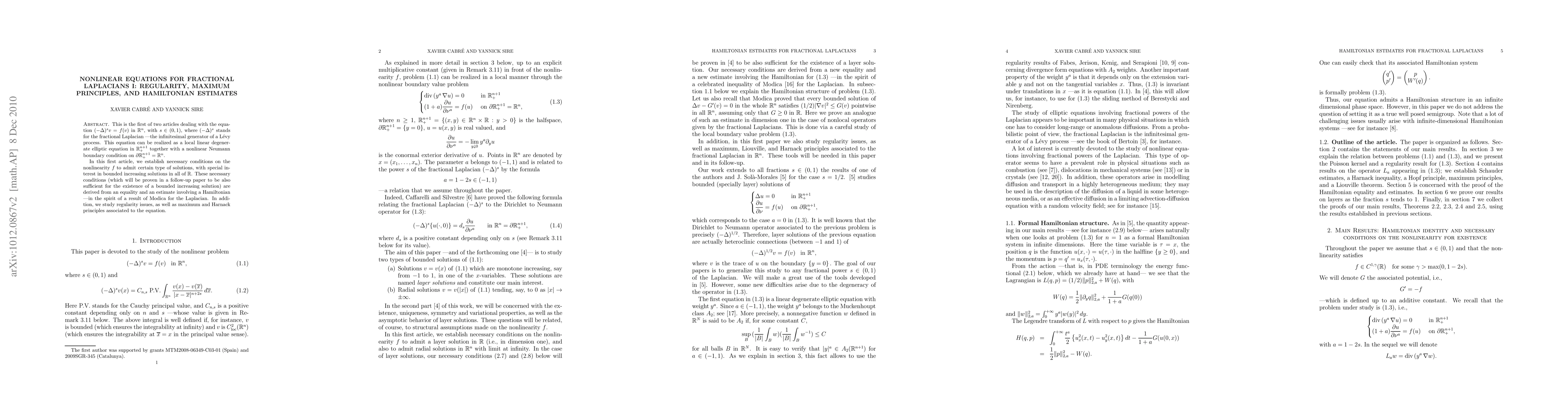This paper, the first in a series, investigates the equation (-Delta)^s v = f(v) involving fractional Laplacians. It establishes necessary conditions for solutions, particularly bounded increasing ones in all of R^n, derived from a Hamiltonian equality and estimate. The study also covers regularity, maximum, and Harnack principles related to the equation.