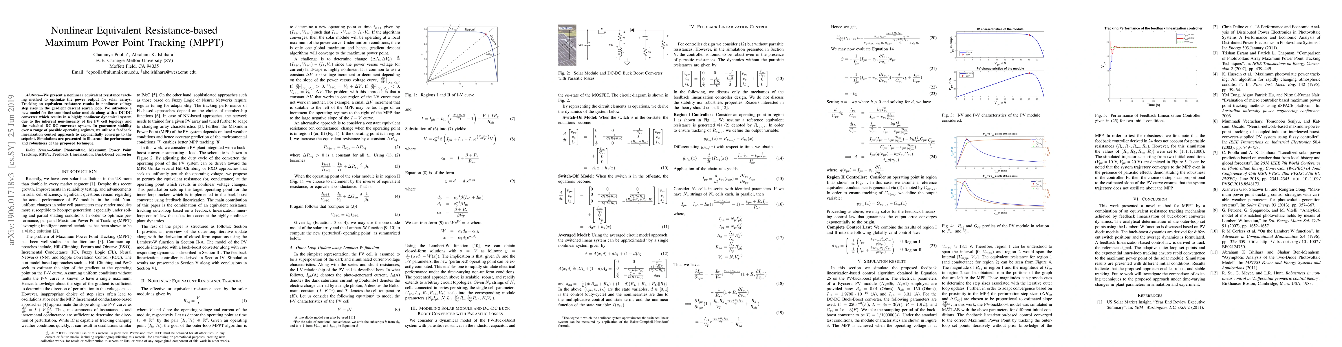 A new approach for maximum power point tracking in solar arrays uses nonlinear equivalent resistance tracking to optimize power output, ensuring stability across different operating regimes.