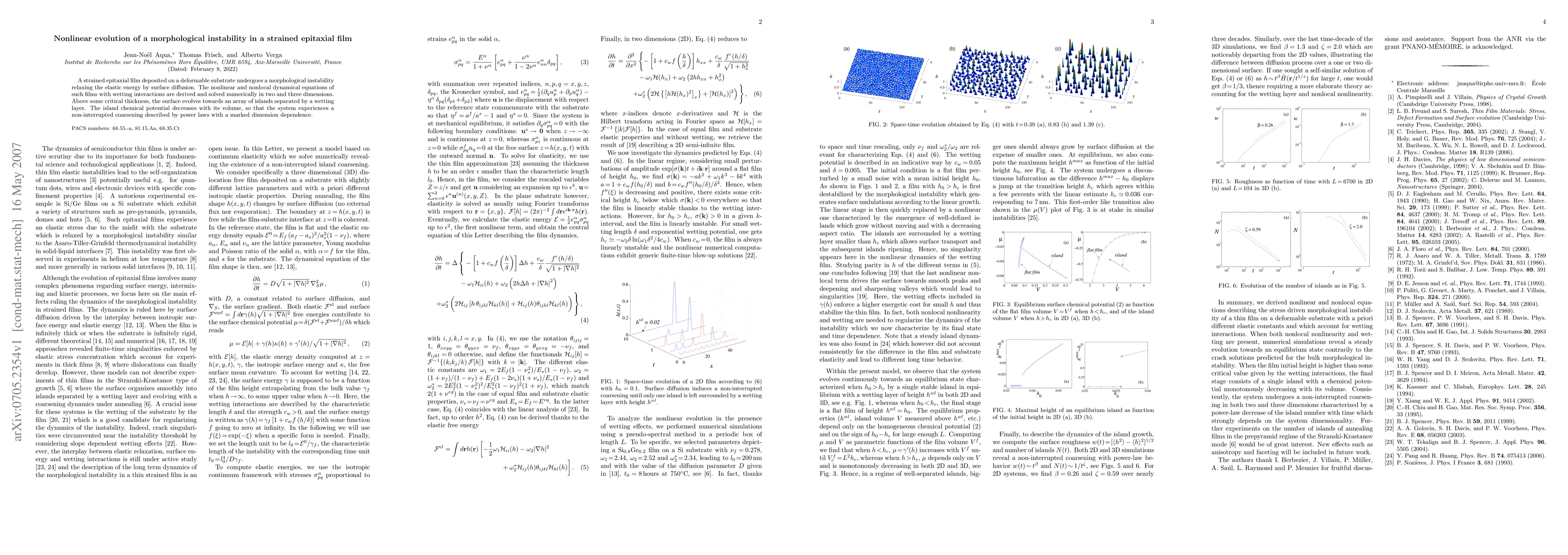 The paper investigates the nonlinear evolution of a morphological instability in strained epitaxial films on deformable substrates, deriving and solving the governing equations numerically. Above a critical thickness, the surface develops into an array of islands separated by a wetting layer, with coarsening behavior characterized by dimension-dependent power laws.