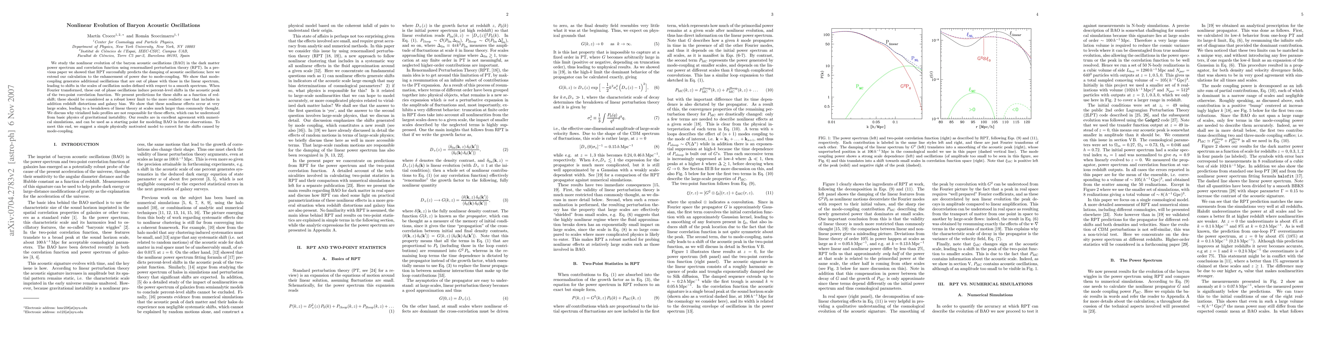 This paper investigates the nonlinear evolution of baryon acoustic oscillations (BAO) using renormalized perturbation theory, showing that mode-coupling generates additional out-of-phase oscillations, leading to shifts in the acoustic peak of the two-point correlation function. The results indicate that nonlinear effects occur at larger scales than previously thought, and suggest a model for correcting these shifts.