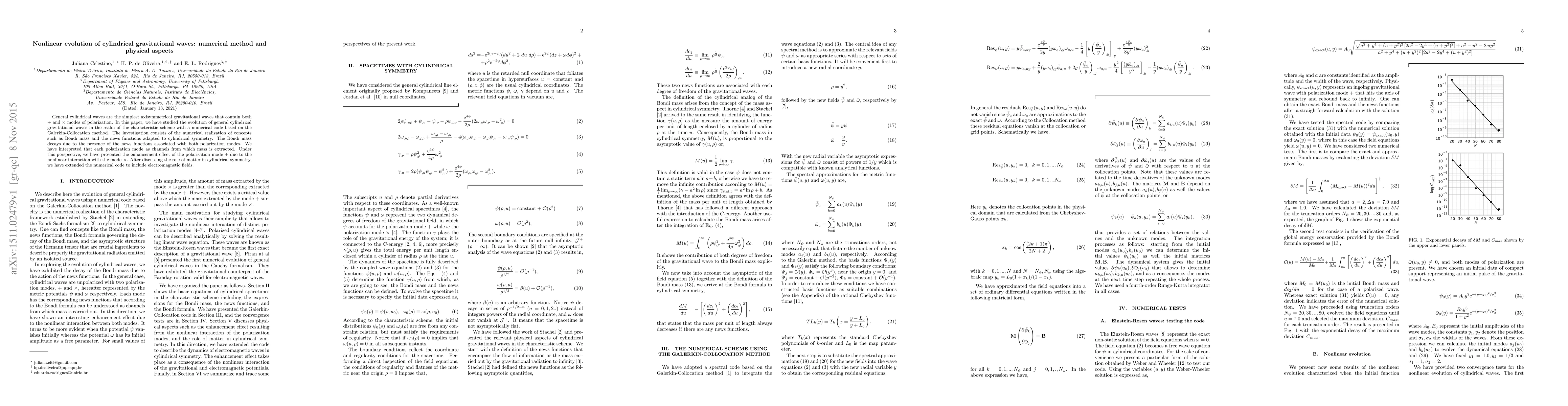 General cylindrical waves are the simplest axisymmetrical gravitational waves that contain both $+$ and $\times$ modes of polarization. In this paper, we have studied the evolution of general cylindrical gravitational waves in the realm of the characteristic scheme with a numerical code based on the Galerkin-Collocation method. The investigation consists of the numerical realization of concepts such as Bondi mass and the news functions adapted to cylindrical symmetry. The Bondi mass decays due to the presence of the news functions associated with both polarization modes. We have interpreted that each polarization mode as channels from which mass is extracted. Under this perspective, we have presented the enhancement effect of the polarization mode $+$ due to the nonlinear interaction with the mode $\times$. After discussing the role of matter in cylindrical symmetry, we have extended the numerical code to include electromagnetic fields.