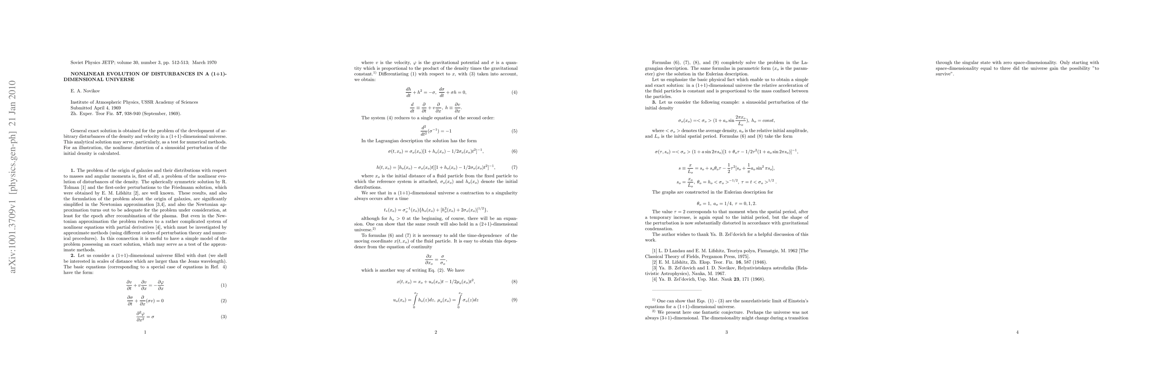 General exact solution is obtained for the problem of the development of arbitrary disturbances of the density and velocity in a (1+1)-dimensional universe. This analytical solution may serve, particularly, as a test for numerical methods. For an illustration, the nonlinear distortion of a sinusoidal perturbation of the initial density is calculated.