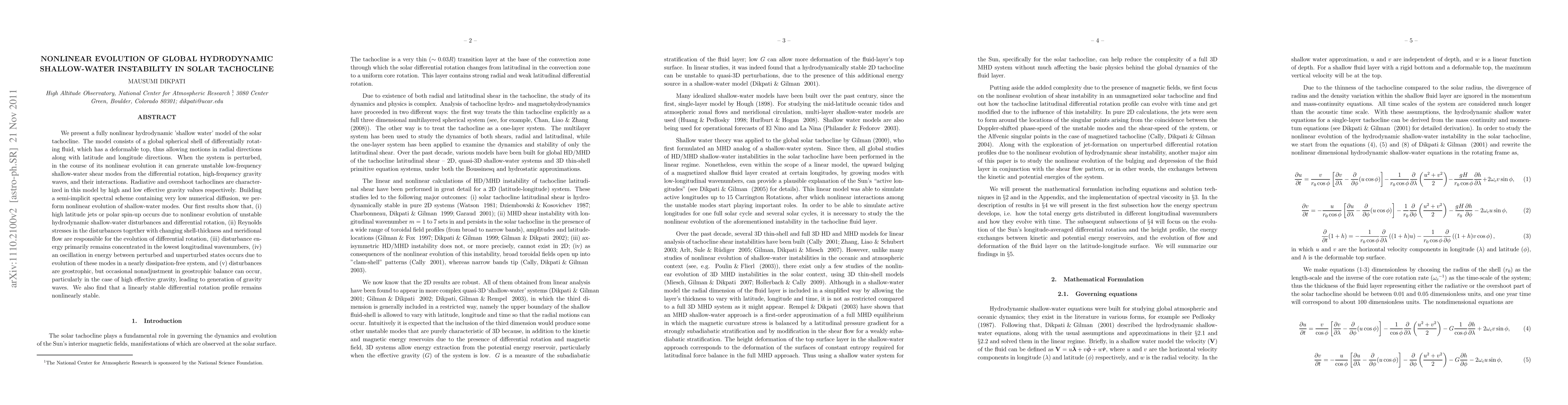 This paper investigates the nonlinear evolution of shallow-water hydrodynamic instabilities in the solar tachocline using a global spherical shell model. The study reveals high latitude jets and polar spin-up due to unstable shallow-water disturbances, and shows that differential rotation evolves through Reynolds stresses and meridional flow.