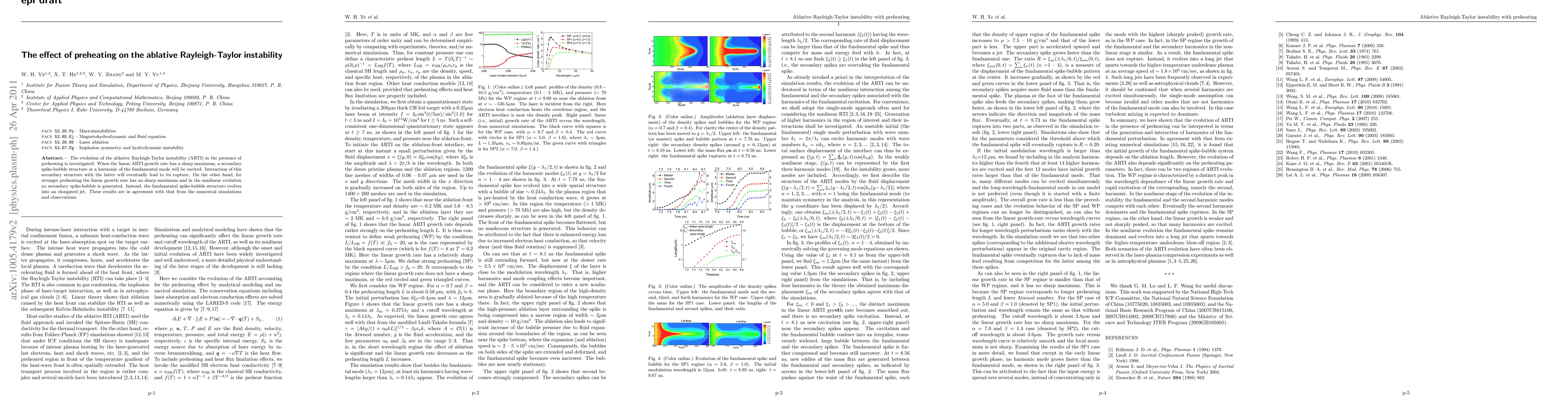 This paper investigates the nonlinear evolution of the ablative Rayleigh-Taylor instability with preheating, finding that the evolution depends heavily on the preheating length. For weak preheating, a secondary spike-bubble structure forms and interacts with the master spike-bubble, causing its rupture. In contrast, strong preheating leads to an elongated jet without secondary structures.